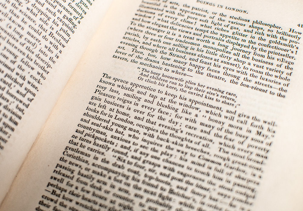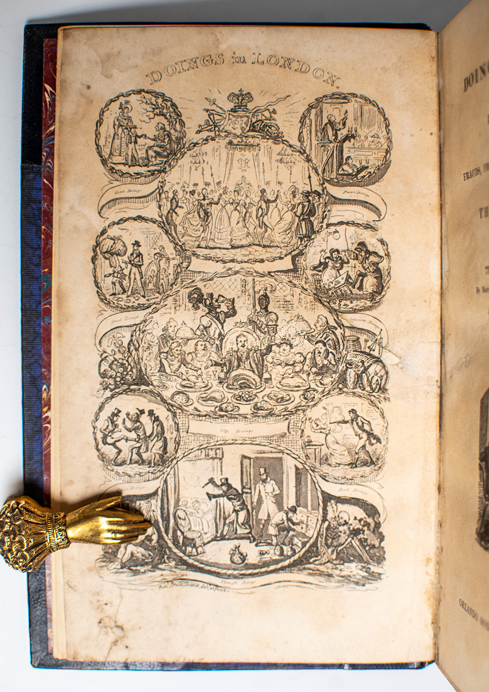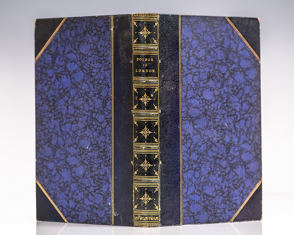 Finely bound example of this spirited survey of London life. Octavo, bound in three-quarters modern morocco with gilt titles and tooling to the spine in six compartments within raised gilt bands, double gilt ruling to the front and rear panels, marbled endpapers, frontispiece and title page vignette, illustrated with thirty-three black and white engravings. In very good condition with light rubbing and toning, repair to the title page and frontispiece. Illustrated by legendary nineteenth century illustrator George Cruikshank. Bookplate to the front pastedown.
