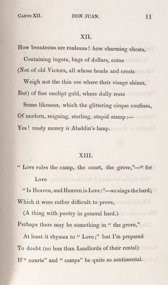 "The War and Peace of English poetry, Don Juan contains an epic sweep that moves from Spain, to the East, and to Russia before ending in England… At the same time that Byron's broad canvas foretells the scope of the great 19th-century novels, the poet's own sensibilities echo the picaresque 18th-century novels of his early reading, Smollett and Fielding, with their bawdy humor and sly inversions of vice and virtue. Unlike these prose narratives, however, Don Juan has no beginning, middle, or end. It draws us in, not to learn 'what happens next' but to hear what this seductive, confidential, teasing voice is going to tell us" (Eisler, 610). When Cantos I through V appeared, they did so without the name of either author or publisher on the title page. Publisher John Murray refused to print Byron's dedicatory poem, which ridiculed English poet laureate Robert Southey, and Byron refused to put his name on a censored publication. Because of Byron's change from his long-standing publisher Murray to John Hunt (brother of writer Leigh Hunt) midway through Don Juan, complete first-edition copies with all cantos are scarce.