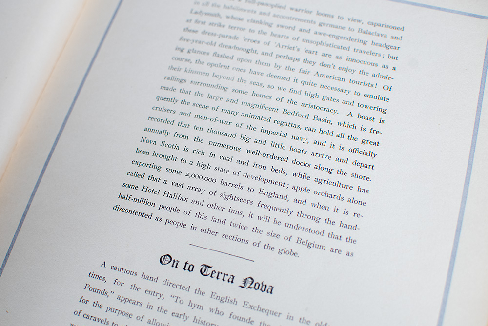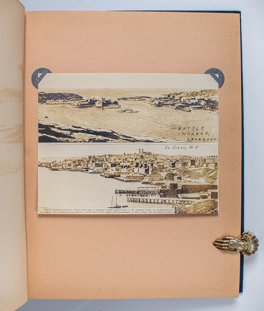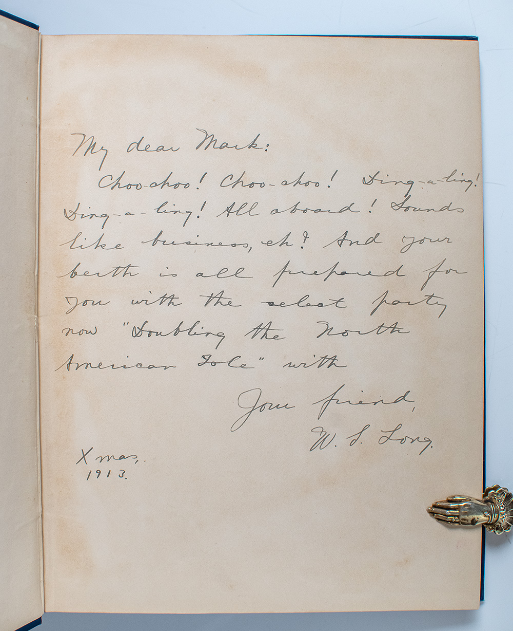 First edition of this early twentieth century travelogue of Canada and the western part of the United States of America. Quarto, original blue cloth with gilt titles to the front panel, triple ruling stamped in blind to the front and rear panels, illustrated with 14 mounted sepia toned gelatin silver prints. Presentation copy, lengthily inscribed by the author on the front free endpaper, "My dear Mark: Choo-choo! Choo-choo! Sting-a-ling! Sting-a-ling! All aboard! Sounds like business, eh? And your berth is all prepared for you with the select party now 'Doubling the North American Isle' with Your friend, W.S. Long. Xmas, 1913." In very good condition. Rare.