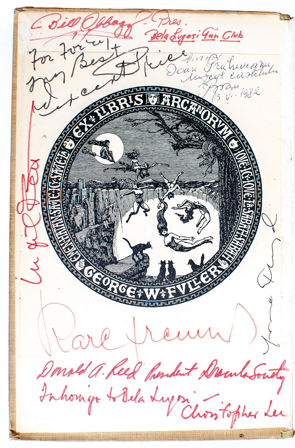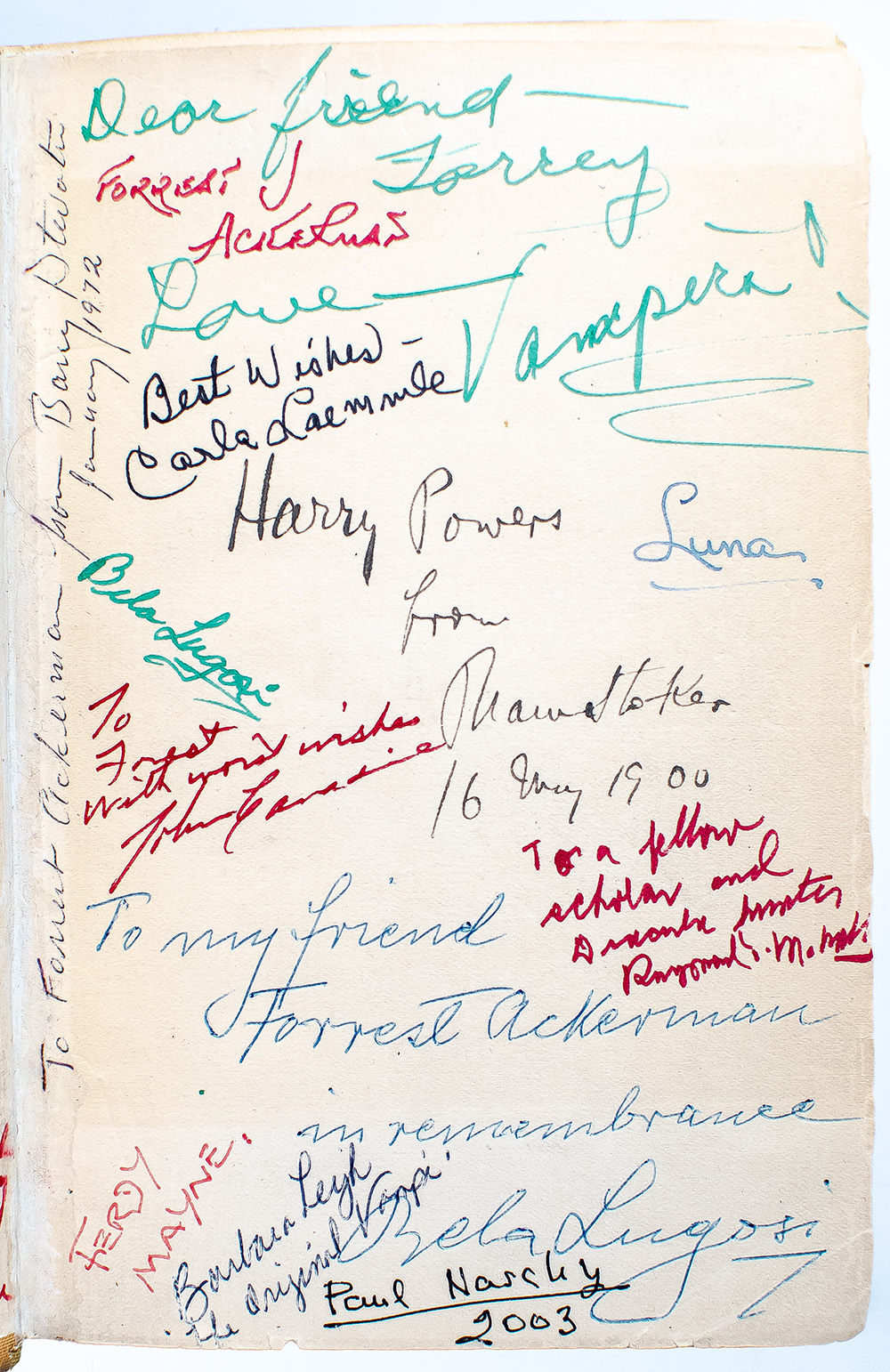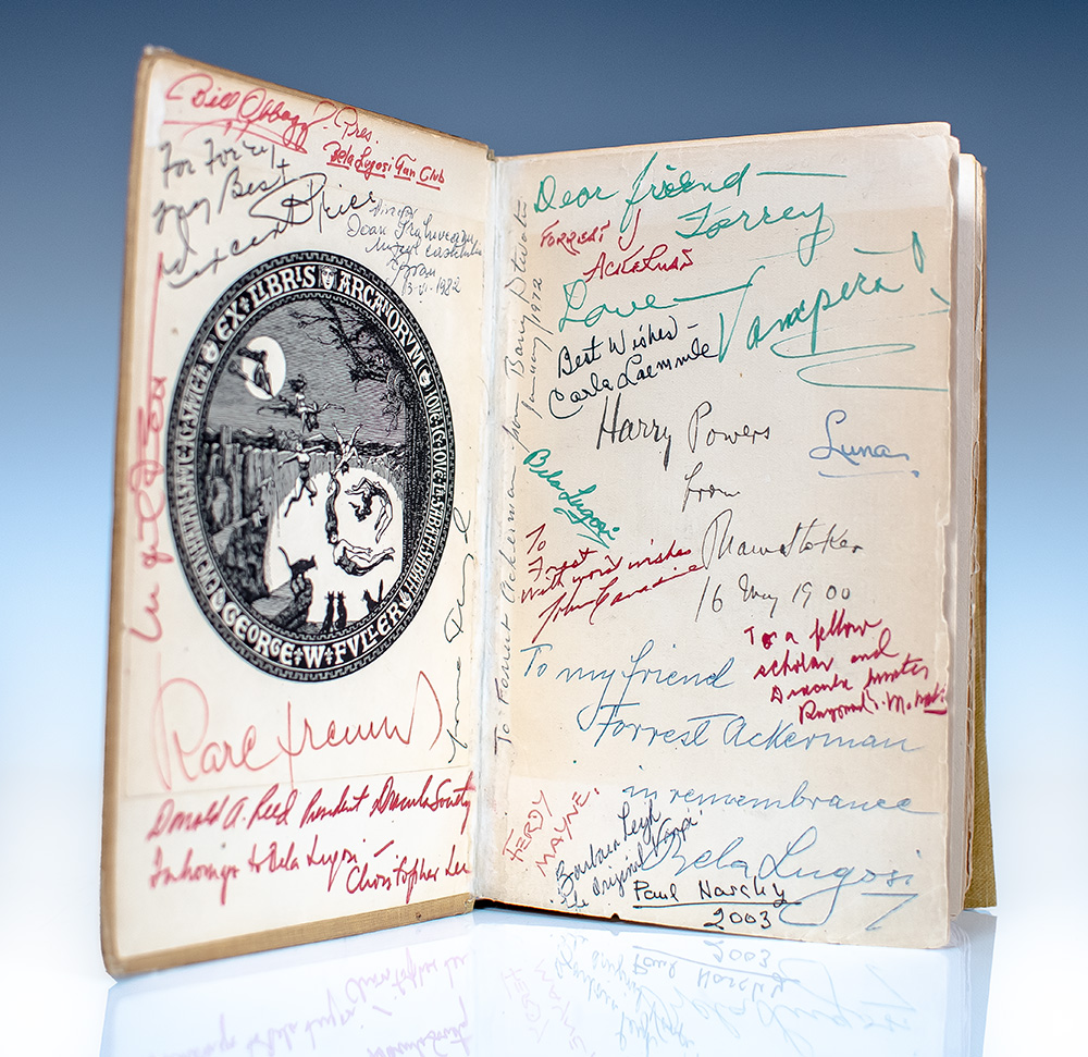 First American edition of Bram Stoker's masterpiece, the progenitor of the vampire genre which remains “arguably the most potent literary myth of the twentieth century” (Leatherdale, 11), signed by him and a host of other actors who portrayed vampires. Octavo, original pictorial beige cloth stamped in blue and gilt. Presentation copy, inscribed by the author on the front free endpaper, "Harry Powers from Bram Stoker 16 May 1900." Subsequently from the collection of George W. Fuller with his bookplate to the pastedown, then Forrest "Forry" J. Ackerman who dedicated his life to building what many consider to have been the world’s largest personal collection of science fiction, fantasy and horror memorabilia. Ackerman purchased the book in the early 1950s and throughout the years had actors who had portrayed vampires, as well as other members of the horror genre, sign the book. Additionally inscribed on the front free endpaper by Bela Lugosi who starred as Count Dracula in the 1931 American film adaptation, "To my friend, Forrest Ackerman, in remembrance, Bela Lugosi" and signed by him again, "Bela Lugosi." Additionally signed and inscribed on the front free endpaper and pastedown by over a dozen legends of horror cinema including Christopher Lee (who starred as Count Dracula in the 1958 English film adaptation), Vincent Price, Bill Obbagy, Ingrid Pitt, Karl Freund, Donald A. Reed, Barry Atwater, Maila Nurmi "Vampira", Carla Laemmle, Carroll Borland, John Carradine, Raymond McNally, Ferdy Mayne, Paul Naschy, and Barbara Leigh. In very good condition with interior tape reinforcements to the hinges, rebacked. Housed in a custom half morocco and chemise clamshell box. A unique example, exceptionally rare and desirable signed by Stoker, Lugosi and such an assemblage of icons of the horror genre.