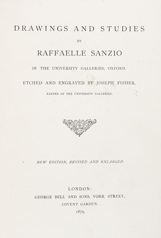 New enlarged edition of the drawings of Raffaelle and Michelangelo in the collection of the University of Oxford, etched by Joseph Fisher. Quarto, bound in three quarters morocco with gilt titles and tooling to the spine, top edge gilt, illustrated with engravings by Joseph Fisher, title vignette, headpieces. In good condition.
