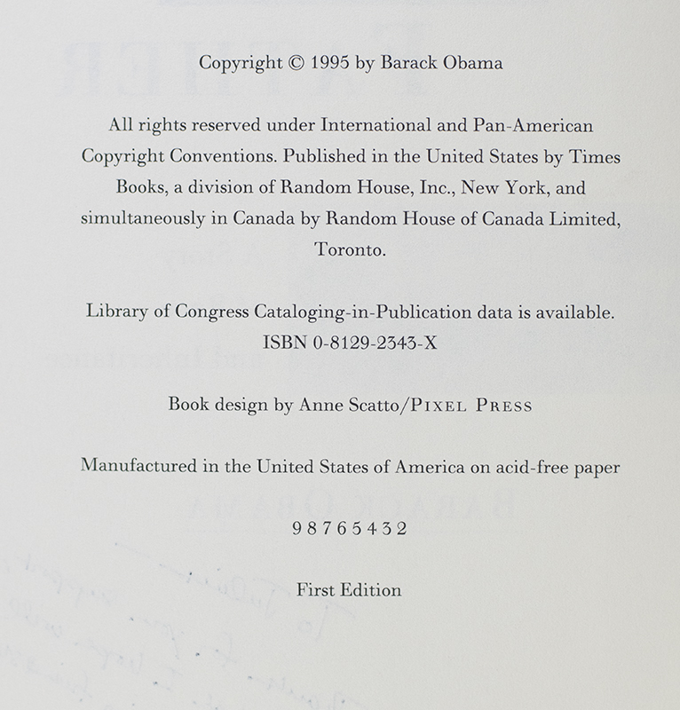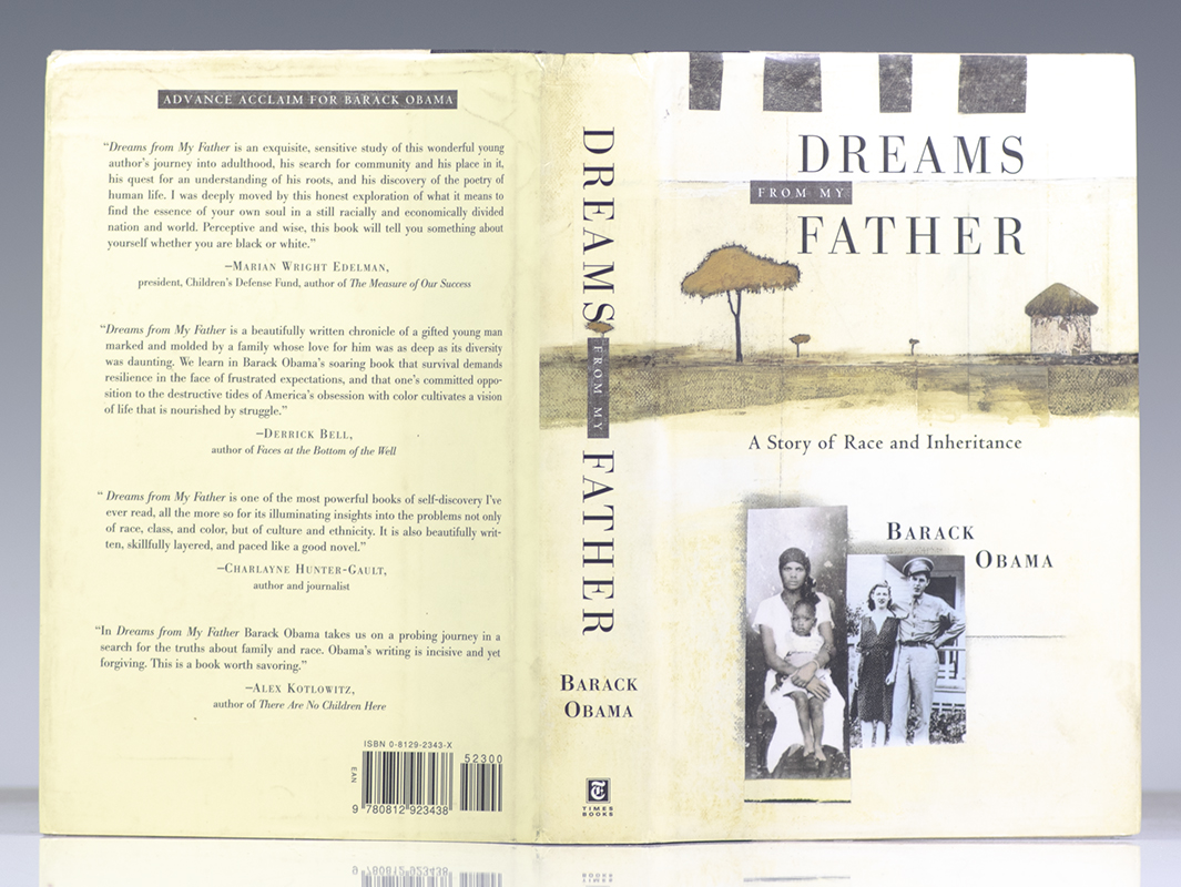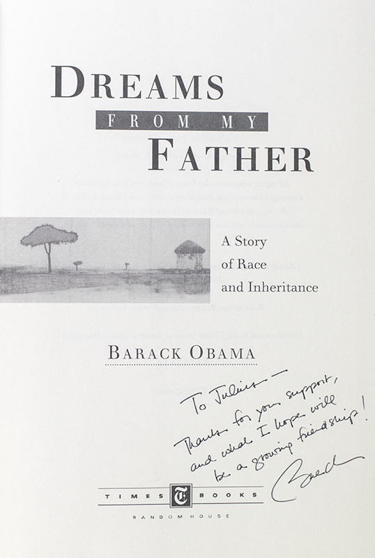 First edition of this memoir by the 44th President of the United States. Octavo, original half cloth, illustrated. Association copy, inscribed by Barack Obama on the half-title page, "To Julius- Thanks for your support, and what I hope will be a growing friendship! Barack." The recipient, Julius Genachowski was the Chairperson of the Technology, Media and Telecommunications Policy Working Group for then Senator Obama's 2008 campaign, which created the Obama Technology and Innovation Plan. He also advised and guided the Campaign's innovative use of technology and the Internet for grassroots engagement and participation. He later went on to become the chairman on the Federal Communication Commission. Examples are usually encountered with just a signature, association copies of this magnitude are uncommon. Fine in a fine dust jacket. Jacket design by Robin Schiff. Jacket art by Steven Dana. Author photograph by Warren Browne.