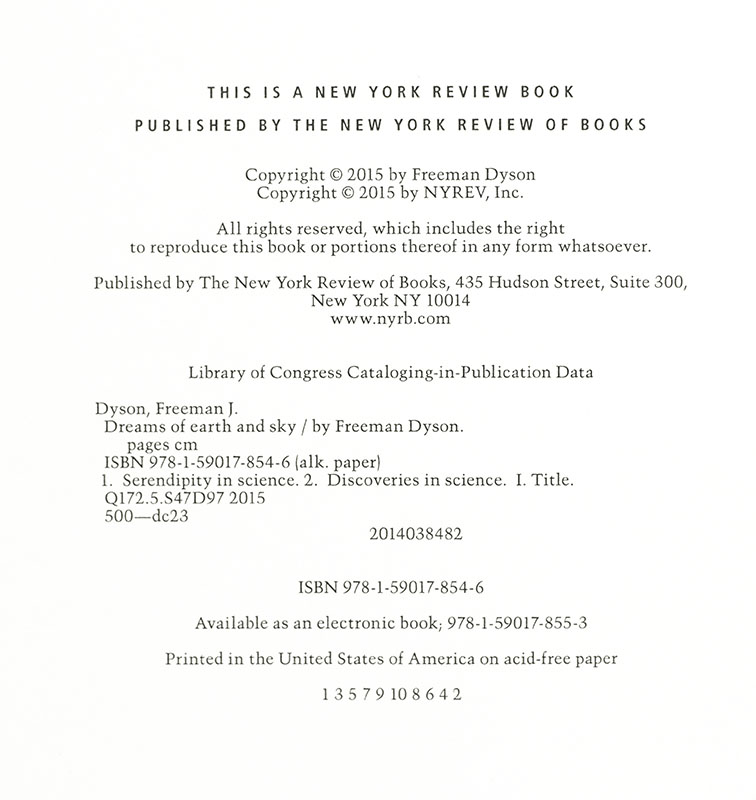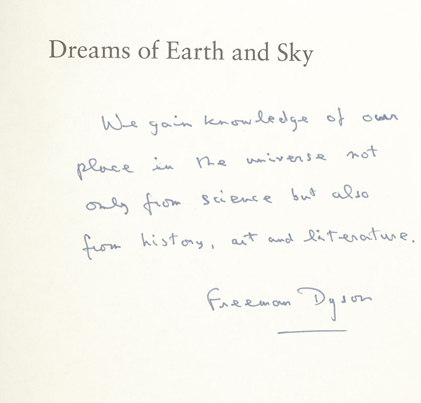 "We gain knowledge of our place in the universe not only from science but also from history, art and literature": First Edition of Dreams and Sky; Signed by Freeman Dyson