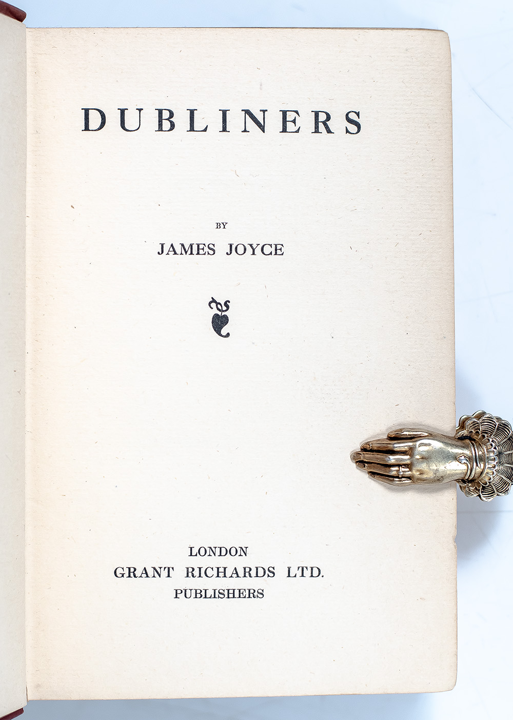 Rare first edition of Joyce’s first prose work, his great collection of short stories, one of approximately 746 copies bound in the publisher's maroon cloth.. Octavo, original red cloth. In very good condition, with the spine gilt fresh, bookplate to the front pastedown. Housed in a custom half morocco and chemise clamshell box. An exceptional example.