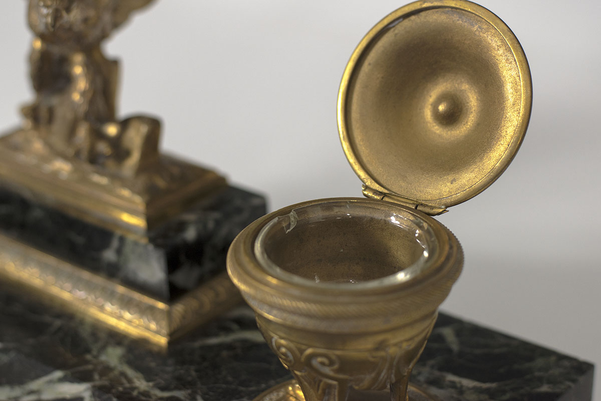 Early 20th Century French Empire Doré bronze inkwell featuring prominently a large bronze eagle flanked by two bronze inkwells on clawed feet. Sited on a green marble base atop two bronze winged lions and two rear feet. The entire piece measures 15.25 inches long, 7.25 inches deep, and 8.5 inches tall. In fine condition. A handsome library decoration.