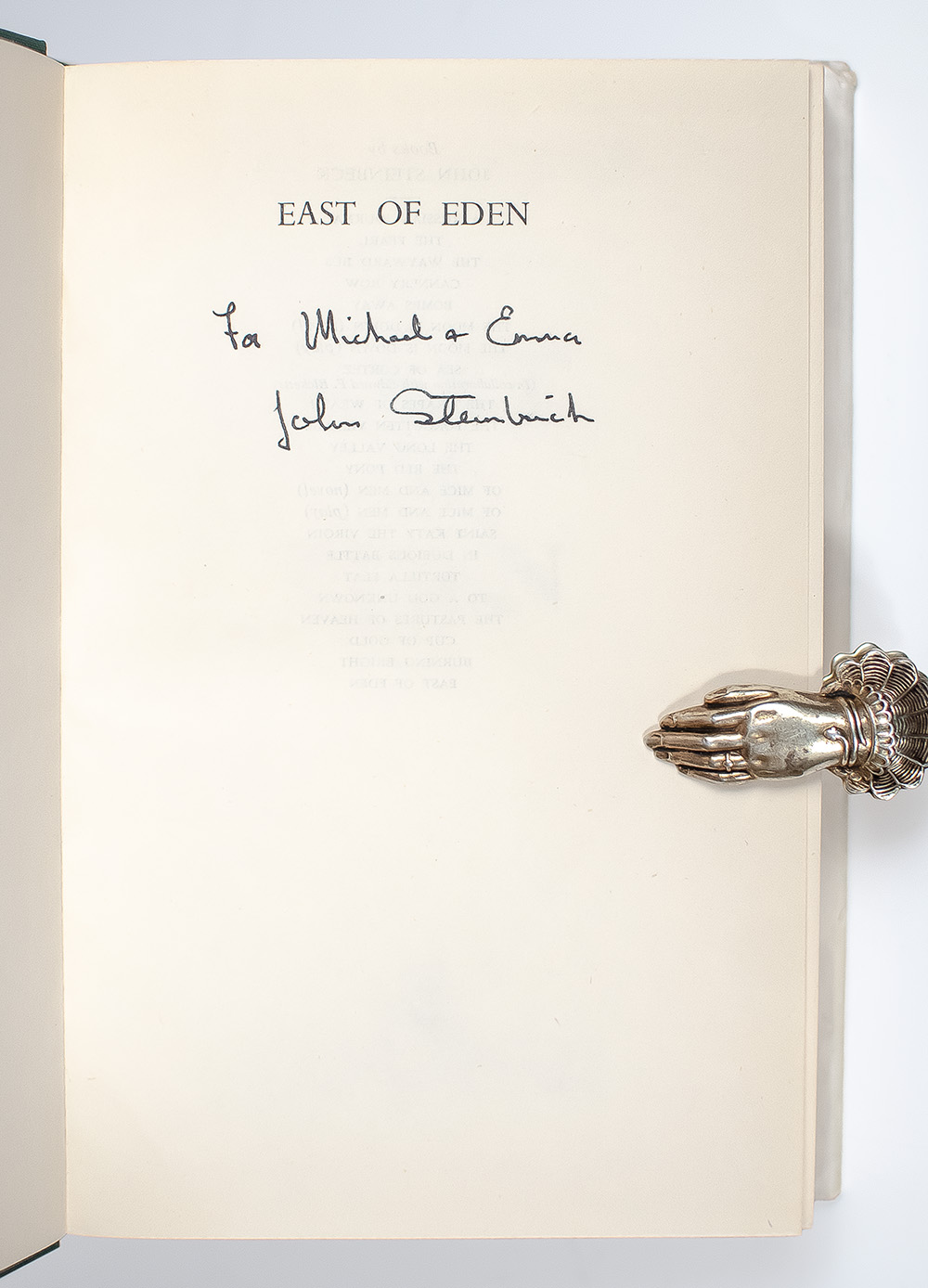 First British edition of Steinbeck's epic and moving story of a modern Cain and Abel. Octavo, original cloth. Presentation copy, inscribed by the author on the half-title page, "For Michael and Emma John Steinbeck." Near fine in a near fine dust jacket. An exceptional example, rare and desirable signed and inscribed.