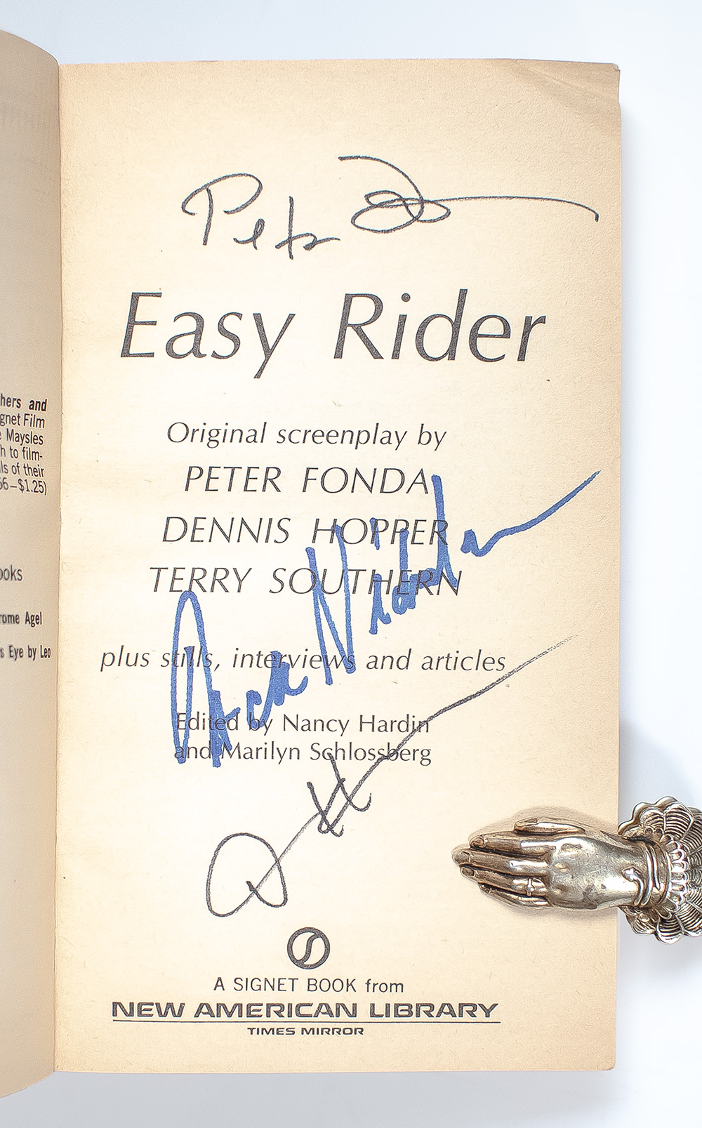 First edition of the complete script, with a selection of black white and color stills, interviews and articles. Octavo, original wrappers as issued, illustrated. Boldly signed by Peter Fonda, Dennis Hopper, and Jack Nicholson on the title page. Edited by Nancy Hardin and Marilyn Schlossberg. In very good condition. Housed in a custom half morocco clamshell box. Rare and desirable signed by the three stars of this iconic film.