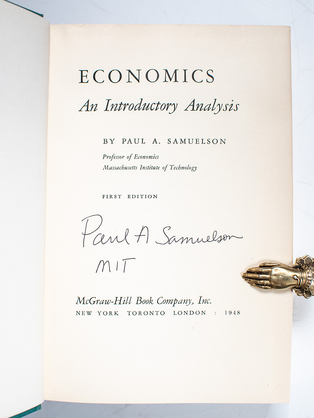 “NO OTHER BOOK HAS CONTRIBUTED SO MUCH TO THE EMERGENCE OF A UNIVERSAL BODY OF ECONOMIC KNOWLEDGE”: PAUL SAMUELSON’S ECONOMICS, FIRST EDITION, SIGNED BY HIM