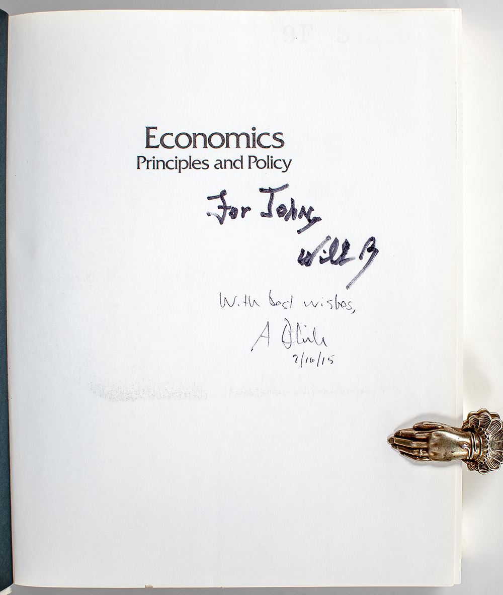 First edition of this cornerstone of economics, which is now in its thirteenth edition. Quarto, original boards. Presentation copy, inscribed by both authors on the half-title page, "For John Will B. and "With best wishes, A. Blinder 9/16/15." In near fine condition, sticker to the front free endpaper. Rare and desirable signed and inscribed.
