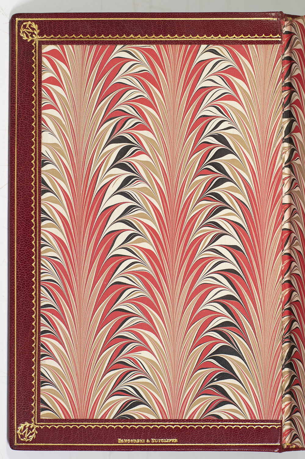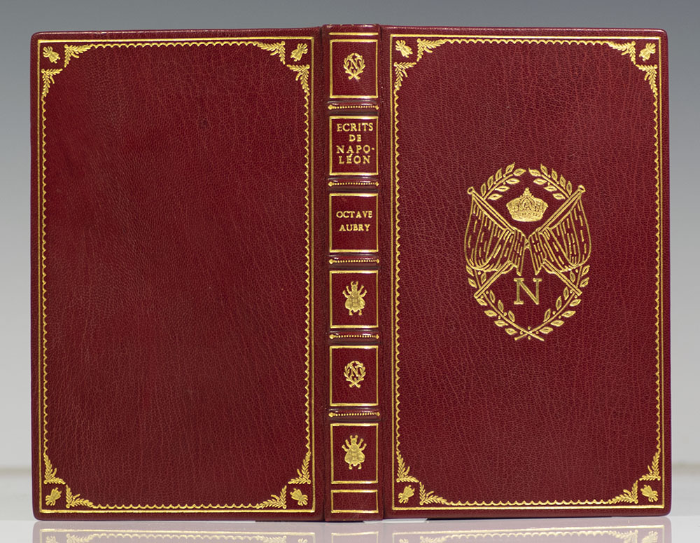Finely bound example of Octave Aubry's Ecrits de Napoleon. Octavo, bound in full crushed red morocco by Sangorski and Sutcliffe with gilt titles and tooling to the spine in six compartments within raised bands, double gilt ruling to the front and rear panels, gilt central vignette to the front panel, gilt turn-ins and inner dentelles, marbled endpapers, all edges gilt. In fine condition. A beautiful example.