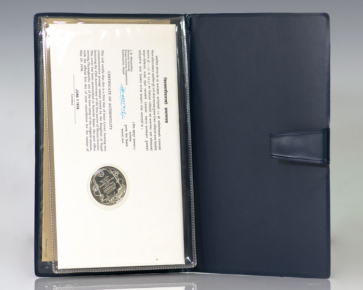 Commemorative cover with an inlaid medallion honoring the 25th anniversary of the first ascent of Mount Everest, boldly signed by both Edmund Hillary and Tenzing Norgay. Housed in its original presentation folder, the cover measures 8 inches by 4.5 inches. In fine condition. An exceptional piece of mountaineering history, signed by the two individuals who ascended Mount Everest.