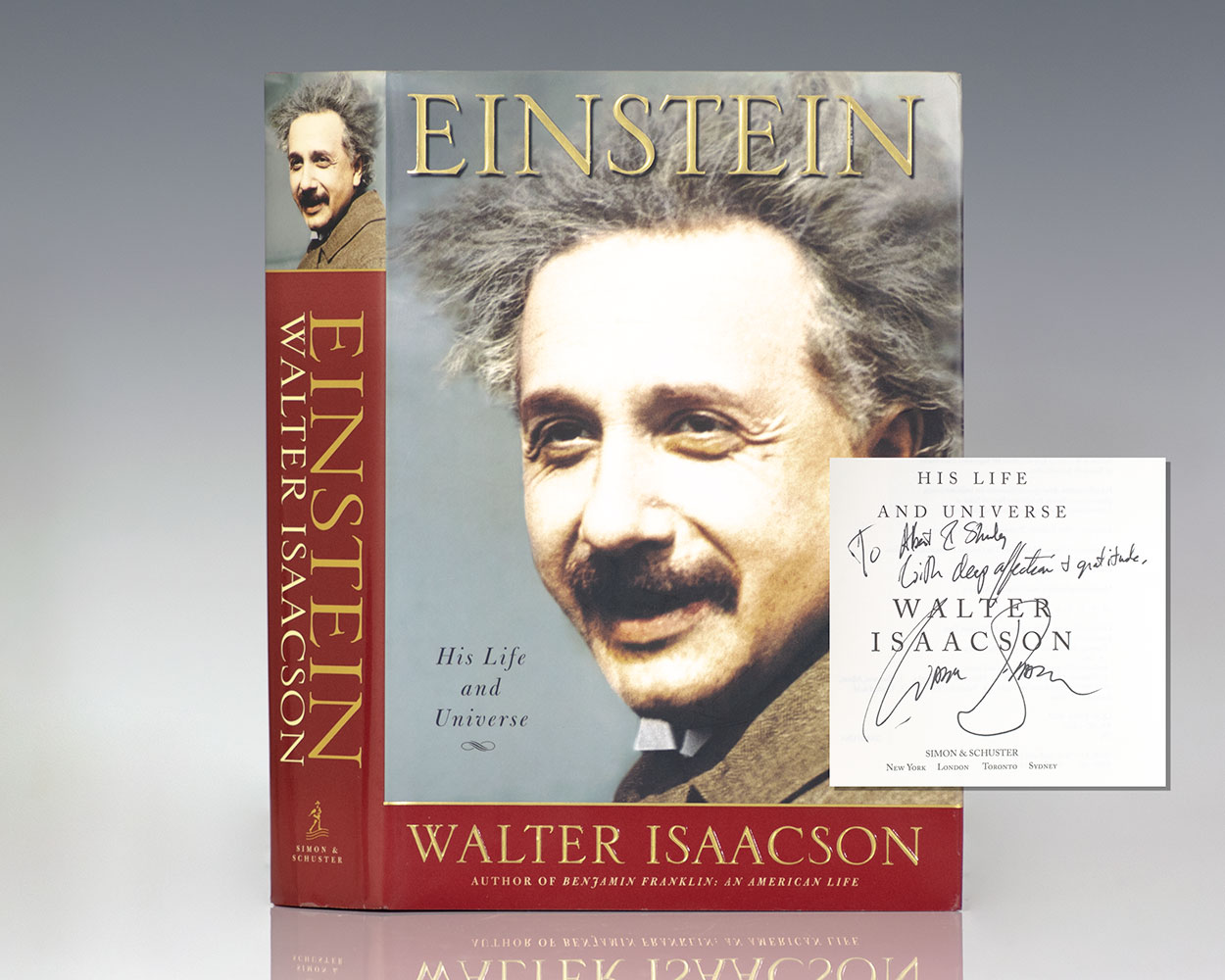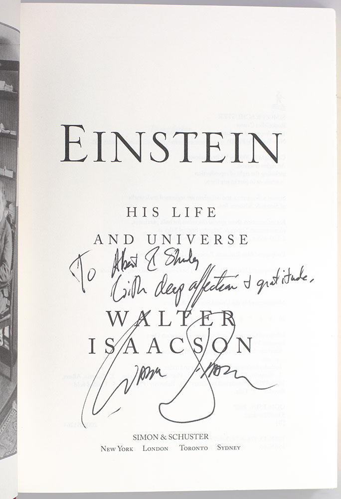 First edition of the definitive biography of Albert Einstein. Octavo, original half cloth, pictorial endpapers, illustrated. Presentation copy, warmly inscribed by the author on the title page, "To Albert and Shirley With deep affection and gratitude, Walter Isaacson." Fine in a fine dust jacket. Jacket design by David Ter-Avanesyan.