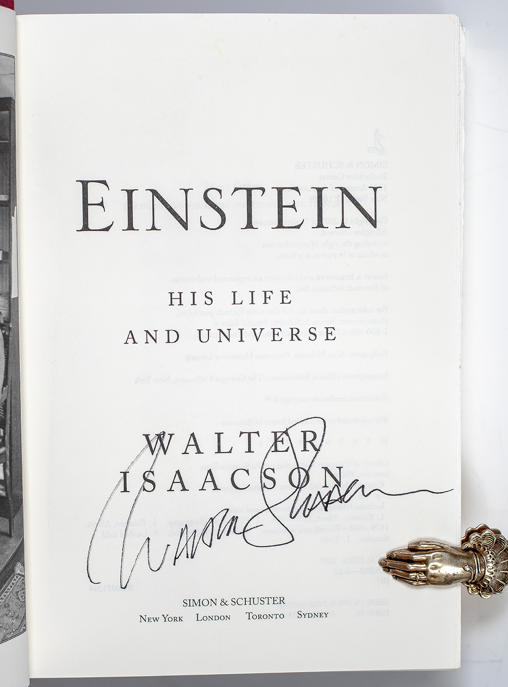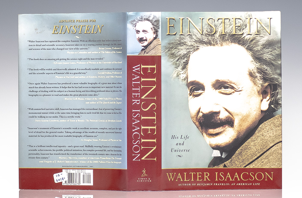 First edition of the definitive biography of Albert Einstein. Octavo, original half cloth, pictorial endpapers, illustrated. Boldly signed by Walter Isaacson on the title page. Fine in a fine dust jacket. Jacket design by David Ter-Avanesyan.