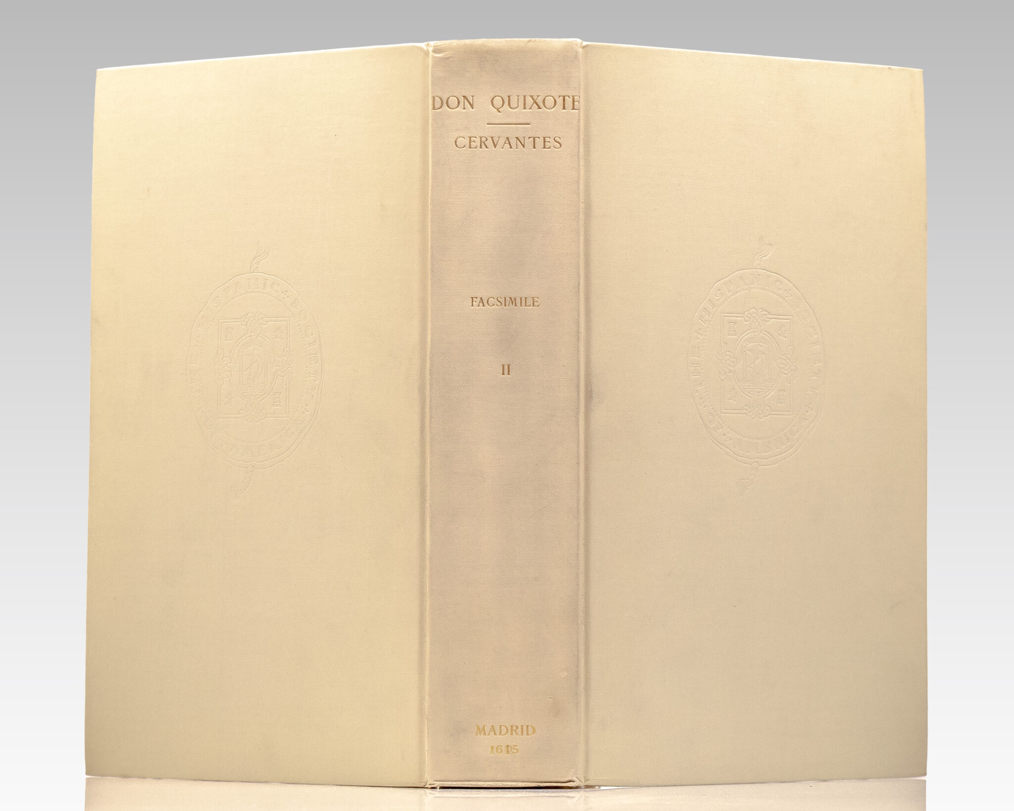 The Hispanic Society of America's notable, limited, and highly regarded facsimile edition of Don Quixote. Octavo, three volumes, original publisher's cloth with gilt titles to the spine, all edges deckled, volume I is a facsimile reproduction of the first edition of 1605, volume II is a facsimile reproduction the 1615 first edition of the second part, volume III reproduces the 1605 fourth edition. One of two hundred numbered copies, this is number 111. In near fine condition, bookplate to the pastedown of each volume. Each volume housed in a custom slipcase. An uncommon complete set.