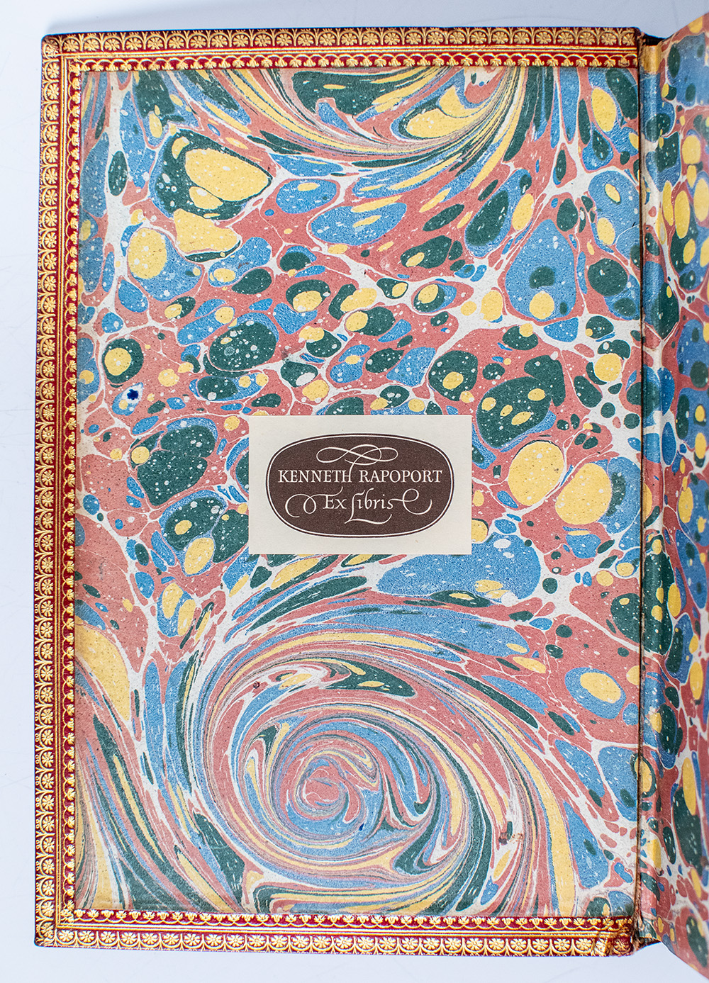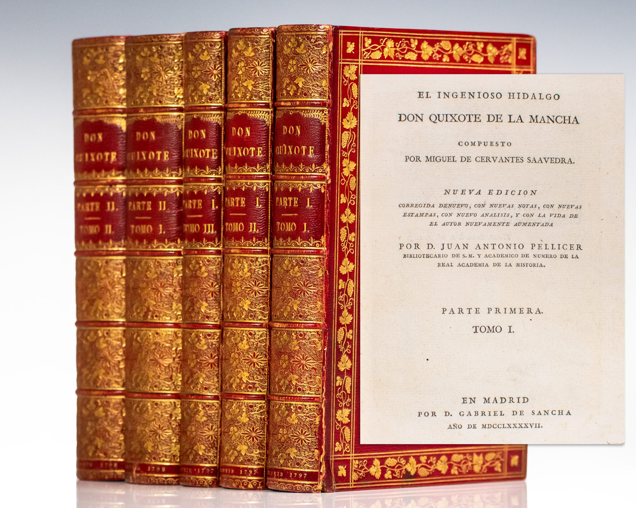 First large paper edition of Juan Antonio Pellicer's new edition of Don Quixote. Octavo, five volumes, bound in full red morocco by Clarke & Bedford with gilt titles and ornately tooled floral detailing to the spines in six compartments within raised bands, elaborate floral ruling to the front and rear panels, top edges gilt, gilt turn-ins and inner dentelles, marbled endpapers, engraved frontispieces to the first books in parts one and two, illustrated with 31 engraved plates and 3 folding maps. In very good condition, signatures in each volume. An exceptional set.
