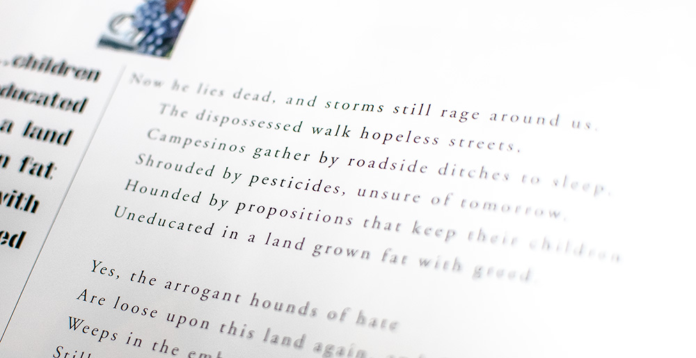 "César Chávez' accomplishments in fighting for the rights of farm workers, civil rights, environmental justice, and non-violence stand next to two of the 20th century's greatest leaders - Mahatma Gandhi and Dr. Martin Luther King Jr." (Carlos Santana). "Each one of us has a role in building the 'house of justice.' Each one of us must make a commitment to build a better society. Yes, we must organize. We must work together. We must fight against oppression. In this way we honor César and all the good men and women who have struggled to better our lives" (Rudolfo Anaya).