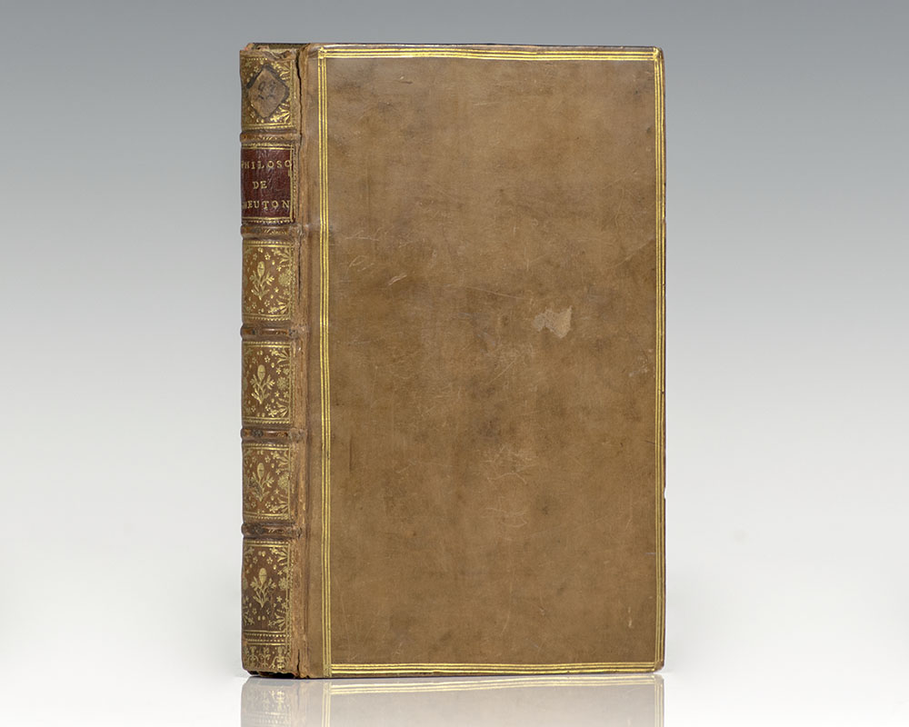 First French edition of one of the most elegantly illustrated science books ever printed and the book that introduced France to Newtonian physics; a scarce presentation copy inscribed by Voltaire. Octavo, bound in full contemporary calf with gilt tooling to the spine in six compartments within raised gilt bands, red morocco spine label lettered in gilt, gilt ruling to the panels, inner dentelles, all edges gilt, marbled endpapers. Illustrated with two frontispiece portraits of both Newton and Voltaire, six full page plates, one folding plate, and illustrations throughout the text. Presentation copy, inscribed by Voltaire on the front free endpaper to William Cheselden, one of the most influential surgeons of 18th century England who attended Newton in his final illness. Although it is unknown if Voltaire and Newton met, Voltaire attended Newton's funeral in 1727 while living in exile in England. During this exile he became an adherent of Newtonian physics and philosophy which he saw as the embodiment of the Enlightenment victory over Christian dogma and as the destroyer of the errors of Cartesianism. Voltaire dedicated the work to his mistress, La Madame la Marquise du Chastellet, who was a fellow scholar of Newton and completed the first French translation of the Principia in 1759. From the library of Dr. Adrian Pollock. A graduate of the University of Cambridge, Pollock was a leader in the field of non-destructive acoustic emission testing, an approach to emission testing which addresses dynamic processes in materials by listening to the energy released by objects. He amassed a large book collection covering the history of science which he acquired throughout his travels between the United States and United Kingdom and from international catalogs. Newton was a particular favorite of Pollock’s as the two scientists worked in the same field and shared an alma mater. In very good condition with light shelfwear. Housed in a custom half morocco clamshell box. Exceedingly rare, surely one of the most significant examples of this work.