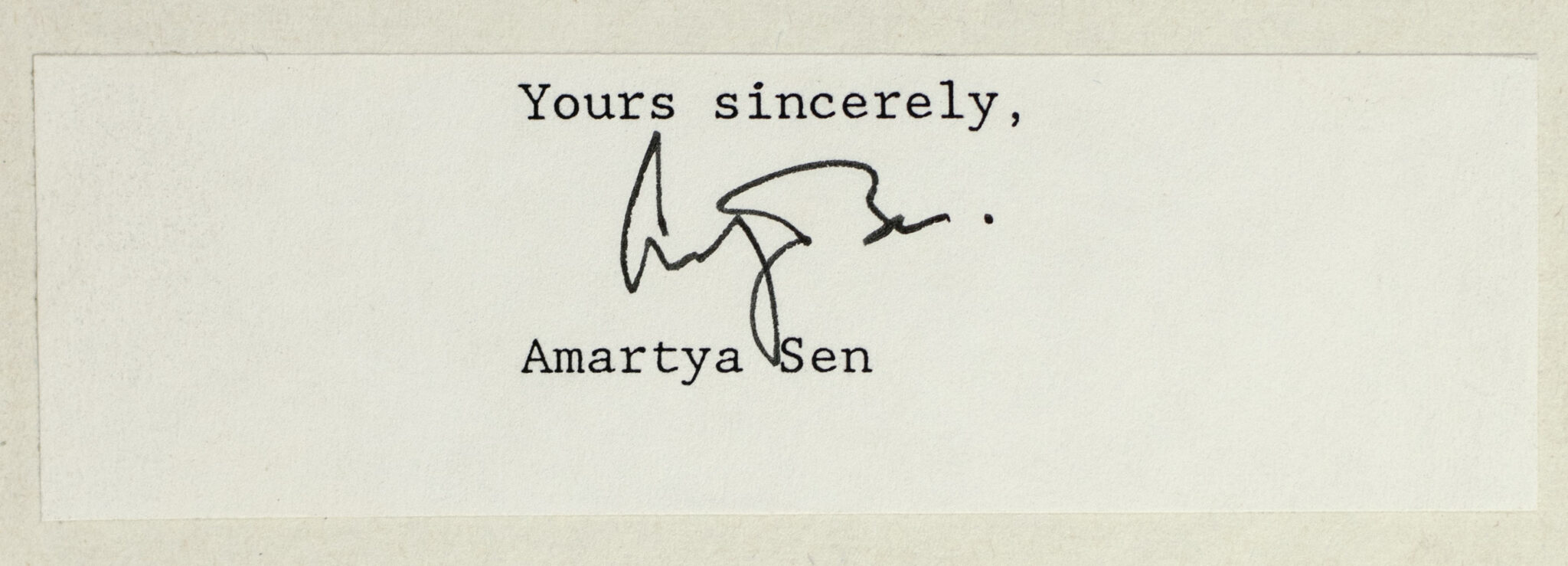 First edition of this early work by the Nobel Prize-winning economist. Octavo, original cloth. Signed by Amartya Sen on a slip attached to the front pastedown. In near fine condition.