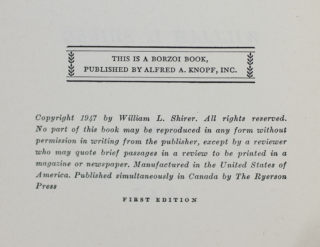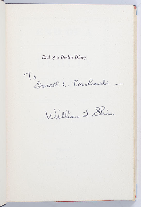 First edition of the sequel to Shirer's acclaimed Berlin Diary. Octavo, original cloth. Presentation copy, inscribed by the author on the half-title page, "To Gareth L. Pawlowski- William L. Shirer." Near fine in a near fine dust jacket. Uncommon signed.