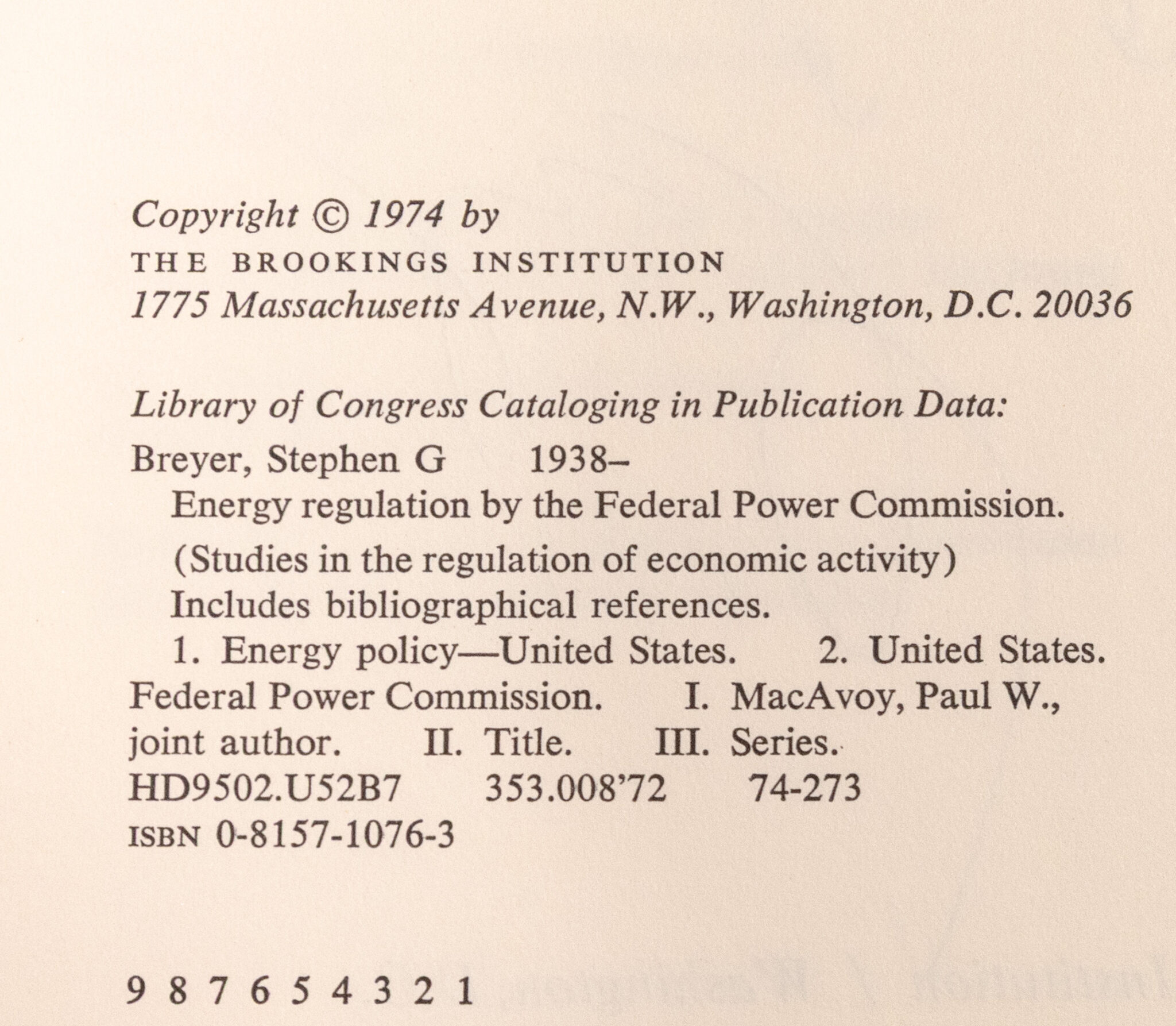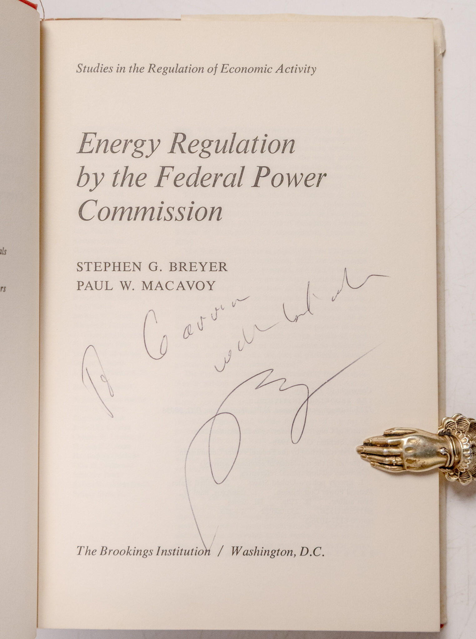 First Edition of Energy Regulation by the Federal Power Commission; Inscribed by Justice Stephen G. Breyer and the Office Copy of Co-Author Paul W. Macavoy with His Ownership Signature
