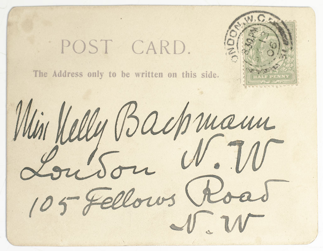 Rare postcard signed by famed Italian tenor Enrico Caruso. One page with the Hotel Cecil, London coat of arms, the post card is addressed to Miss Nelly Bachman in Caruso's hand and signed by him on the verso, "Enrico Caruso London 1906." Caruso has added a self-caricature beneath his inscription. In near fine condition.
