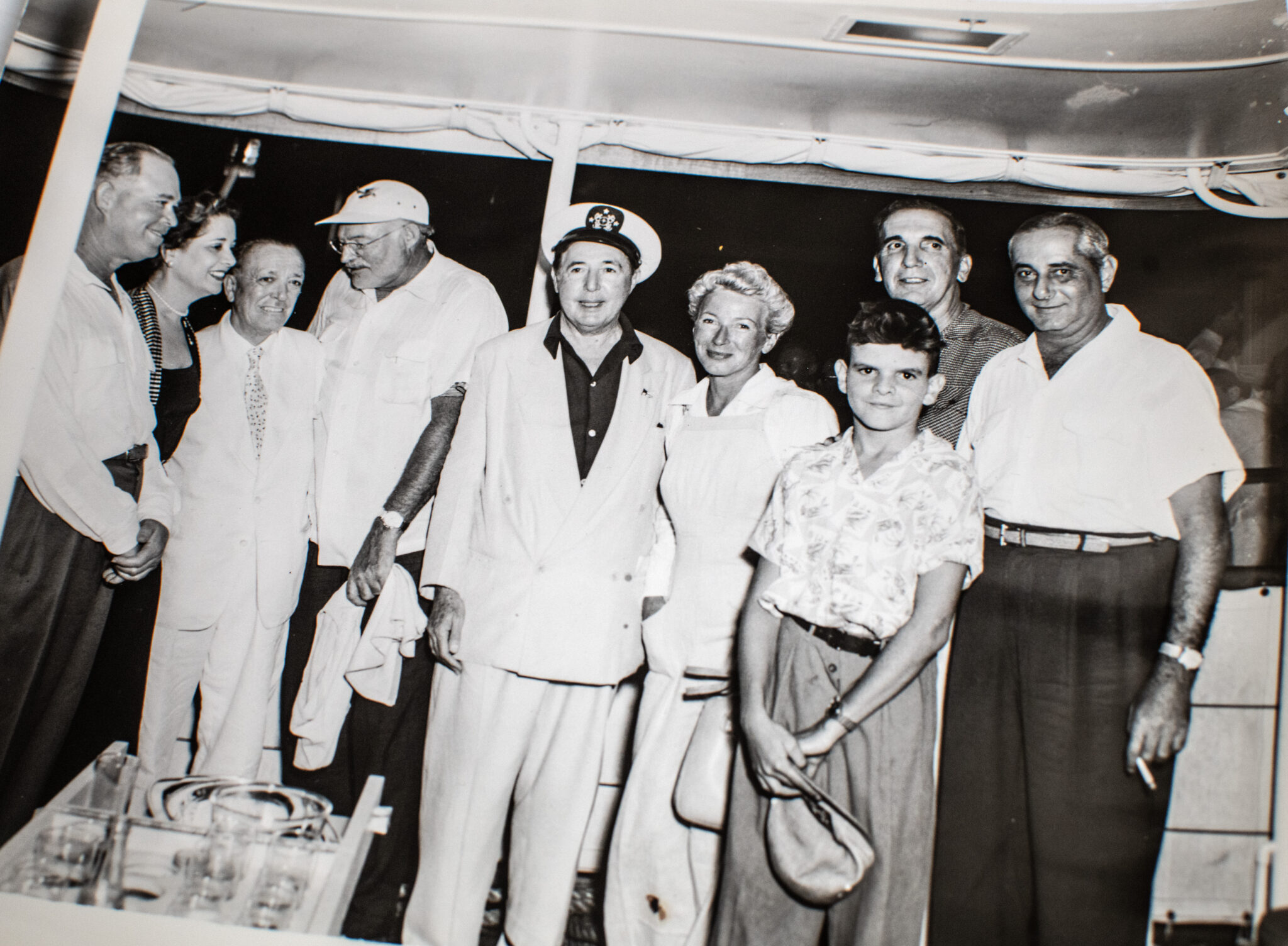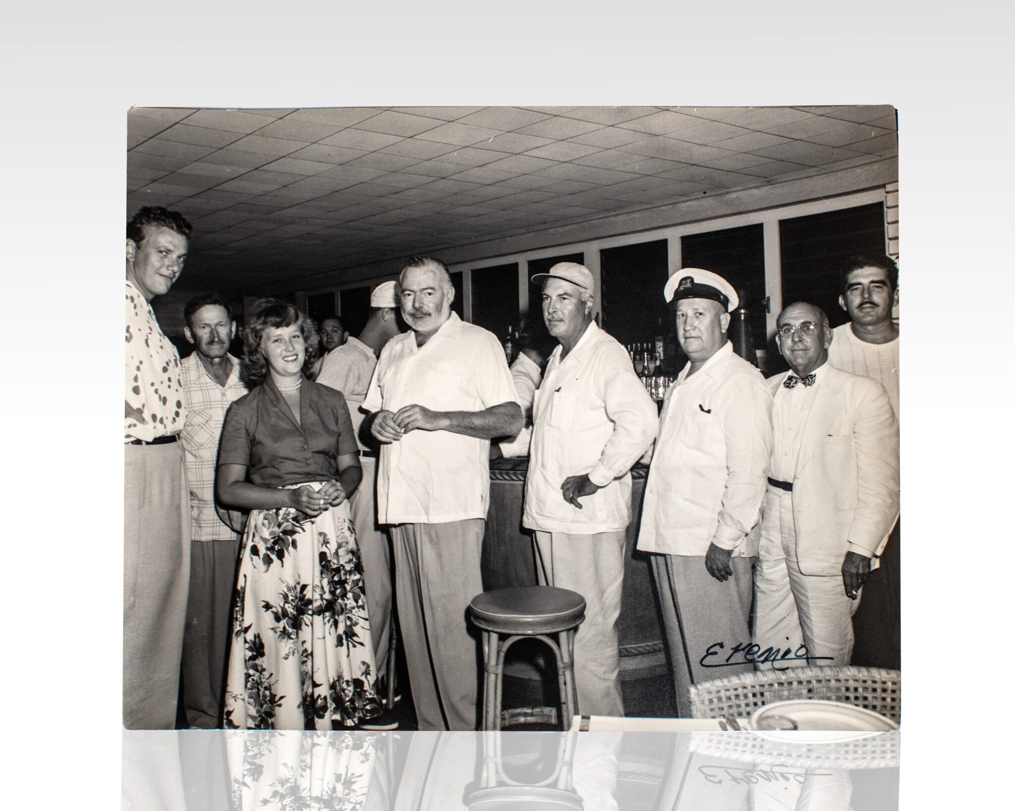 Rare original black and white photograph of legendary American writer Ernest Hemingway. Black and white vintage photograph of Hemingway most likely in a bar in Cuba wearing a white button-up with fishing guide Taylor Williams in a striped button-up to his right. Hemingway’s friendship with Taylor “Beartracks” Williams, the well-known Sun Valley hunting and fishing guide, dated back to their meeting in Idaho in the late 1930s, after which Hemingway frequently returned to Ketchum before eventually settling there. In fine condition. The piece measures 10 inches by 8 inches. Together with another vintage photograph of Hemingway looking away from the camera and Mary Hemingway smiling besides the captain of a boat while they were in Cuba. In near fine condition with light creasing and rubbing. The piece measures 10 inches by 8 inches.