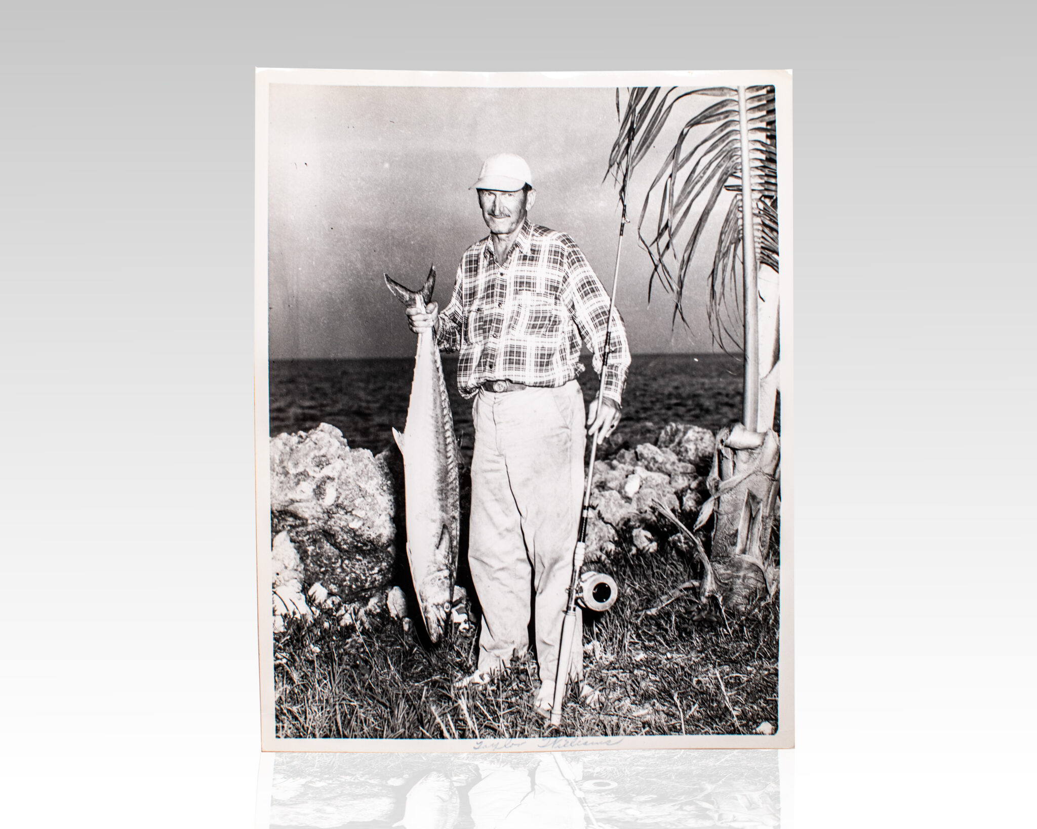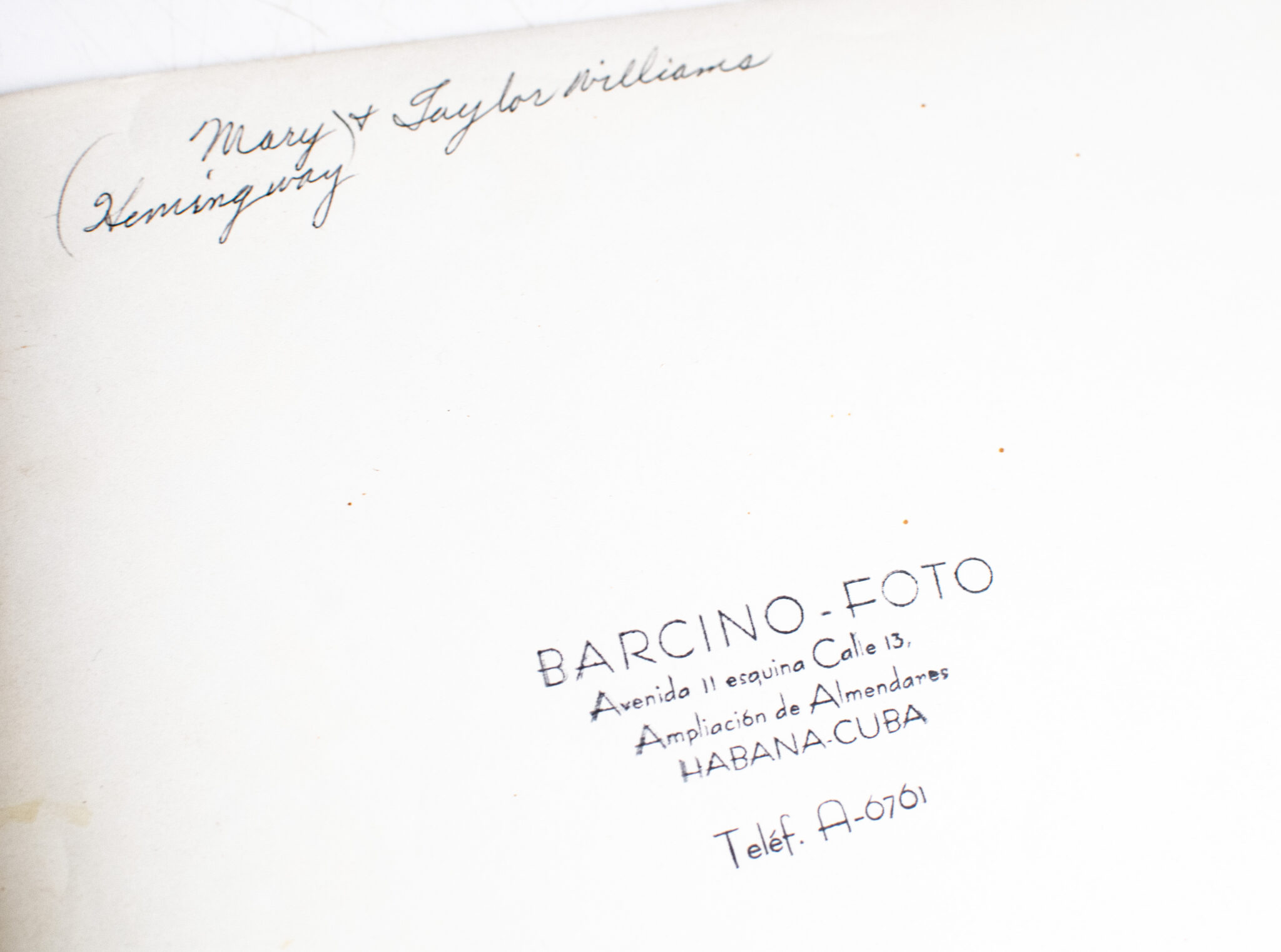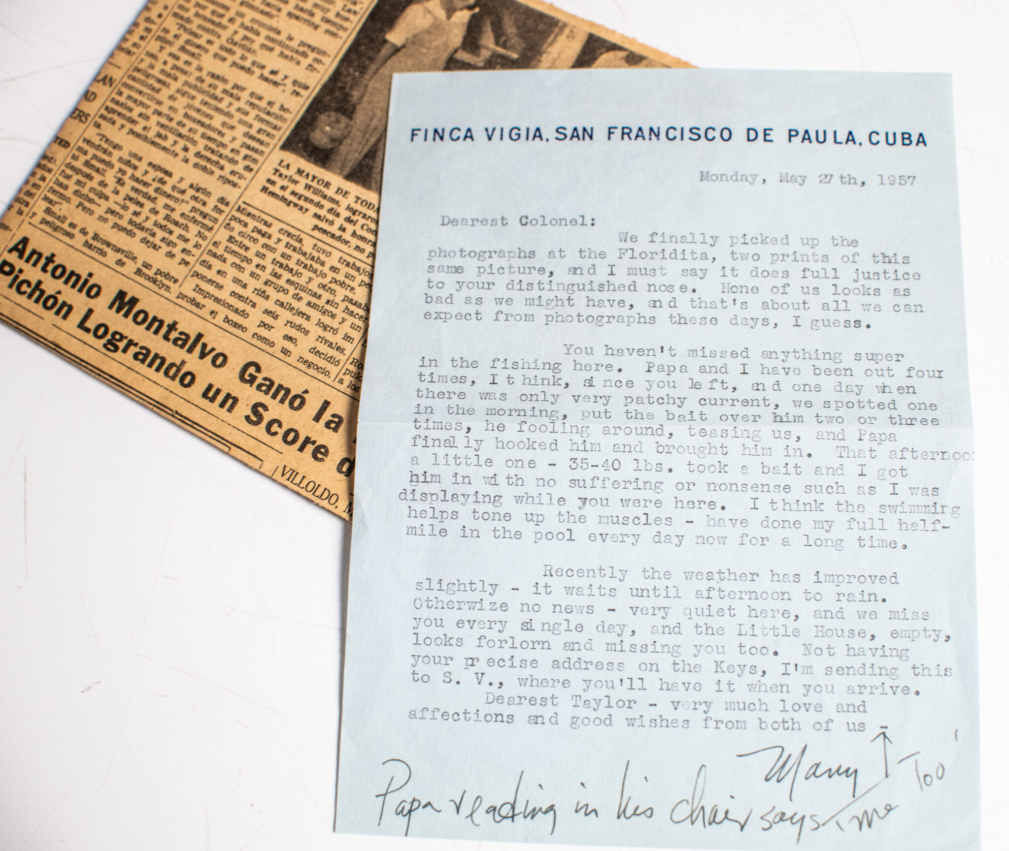 Accompanied by a typed letter signed by Mary Hemingway regarding fishing and Papa. One page, on Finca Vigia stationery from San Francisco de Paula, Cuba, dated 27 May 1957, addressed to Williams (as "Colonel"). The letter reads in full, "Dearest Colonel: We finally picked up the photographs at the Floridita, two prints of this same picture, and I must say it does full justice to your distinguished nose. None of us looks as bad as we might have, and that's about all we can expect from photographs these days, I guess. You haven't missed anything super in the fishing here. Papa and I have been out four times, I think, since you left, and one day when there was only very patchy current, we spotted one in the morning, put the bait over him two or three times, he fooling around, teasing us, and Papa finally hooked him and brought him in. That afternoon a little one - 35-40 lbs. took a bait and I got him in with no suffering or nonsense such as I was displaying while you were here. I think the swimming helps ton up the muscles - have done my full half-mile in the pool every day now for a long time. Recently the weather has improved slightly - it waits until afternoon to rain. Otherwise no news - very quiet here, and we miss you every single day, and the Little House, empty, looks forlorn and missing you too. Not having your precise address on the Keys, I'm sending this to S.V., where you'll have it when you arrive. Dearest Taylor - very much love and affections and good wishes from both of us - Mary. Papa reading in his chair says me too." In fine condition with mail folds. The piece measures 5.75 inches by 7.75 inches.