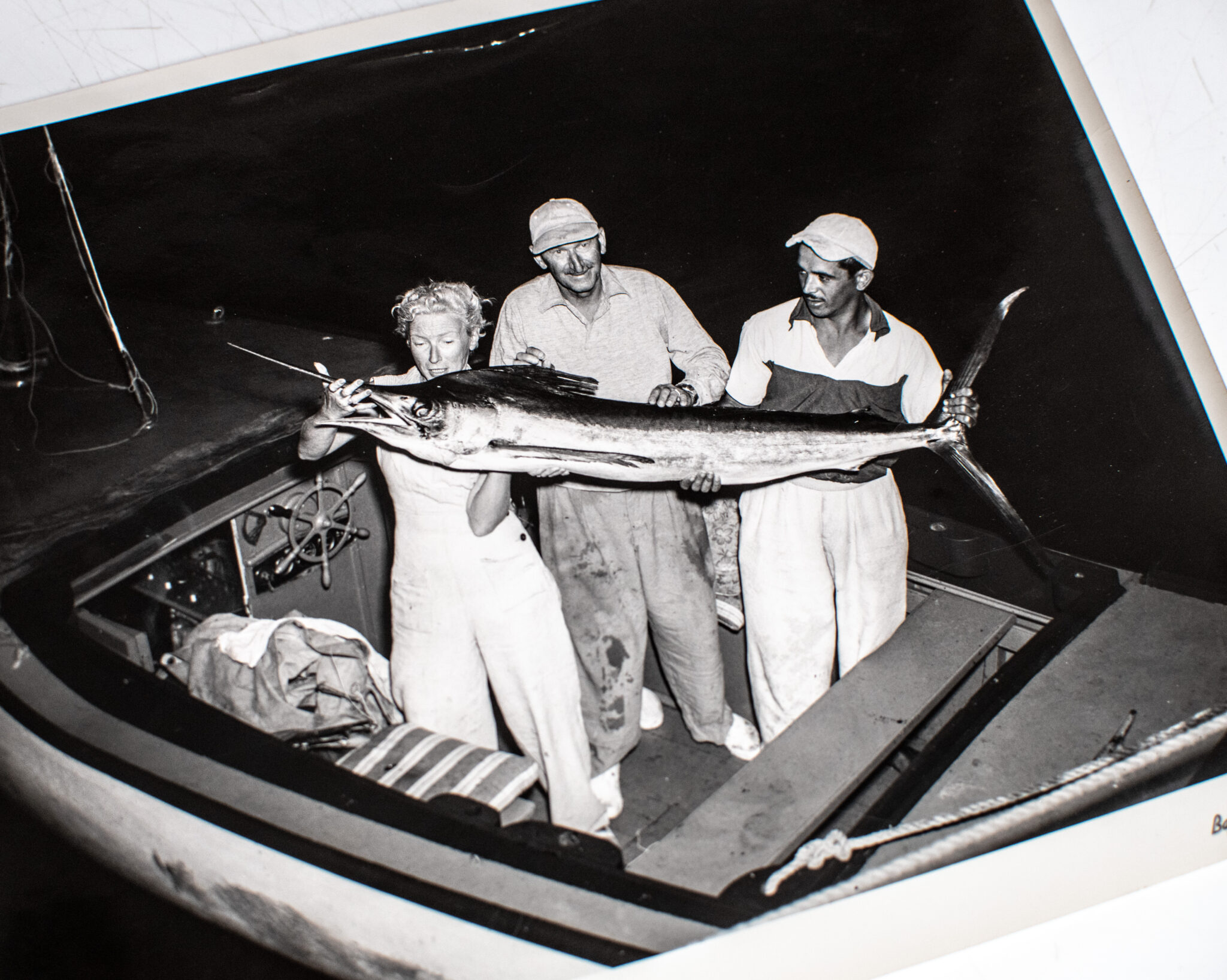 Together with two additional glossy photographs of Taylor Williams. The first of Williams holding a fishing rod and fish. The second of Williams and Mary Hemingway standing on a boat proudly holding up a prize swordfish. In near fine to very good condition. The pieces measure 8 inches by 10 inches. Also with a page from a Cuban newspaper, El Avance Criollo, with an image of Hemingway, Mary, Williams, and a prize fish. In near fine condition with toning and mail folds.