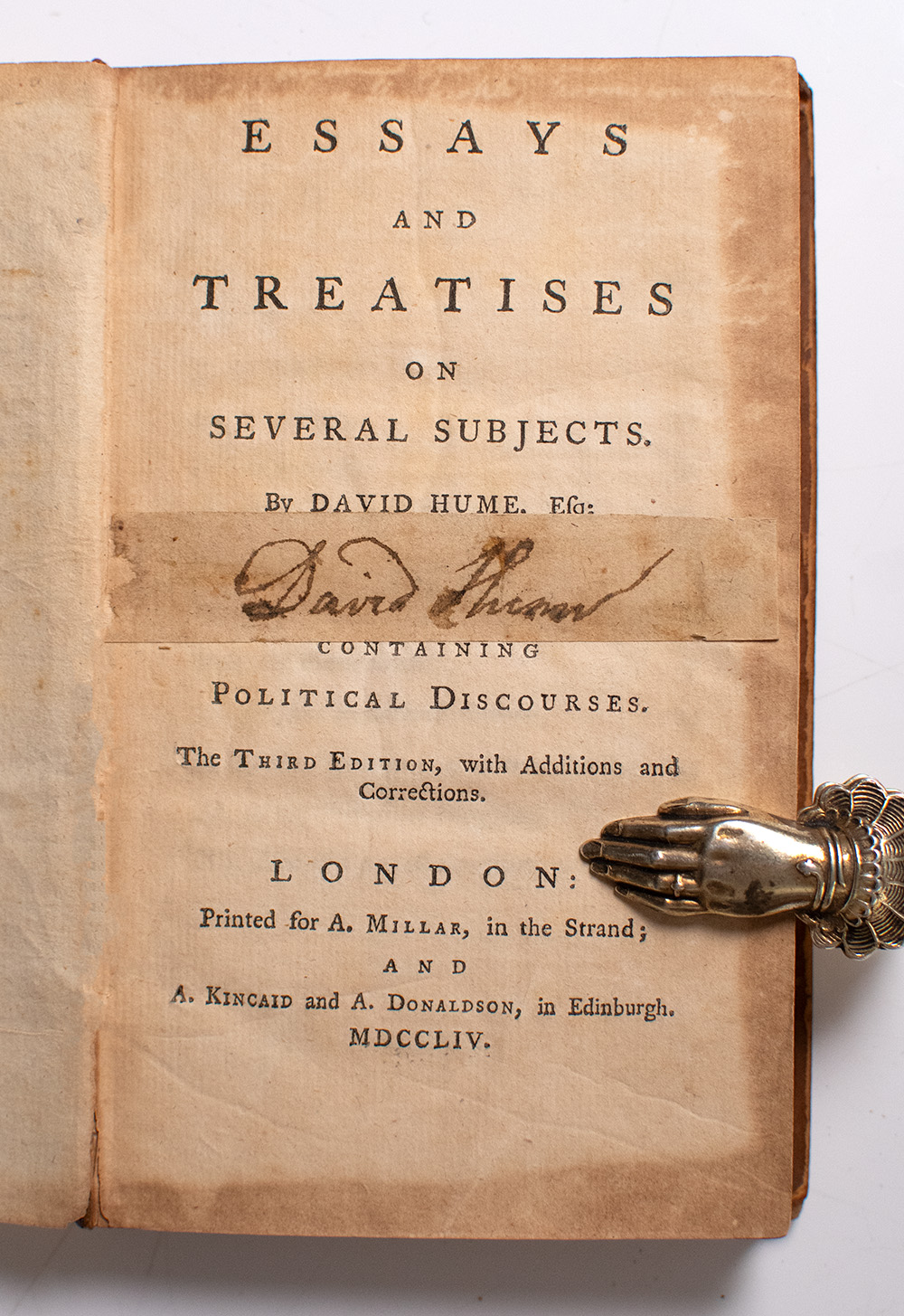 Finely bound example of the fourth volume of Hume's famed essays and treatises on Enlightenment political and economic thought. Duodecimo, bound in full contemporary calf with titles stamped in blind in six compartments within raised bands, gilt turn-ins, all edges speckled red, third edition. Signed by David Hume on the verso of the front free endpaper facing the title page and again on a clipped piece of paper adhered to the title page. In very good condition with toning and wear, reattached. Previous owner contemporary manuscript notes on endpapers. Ownership plate to the front pastedown. Housed in a custom full brown morocco clamshell box. Exceptionally rare and desirable.