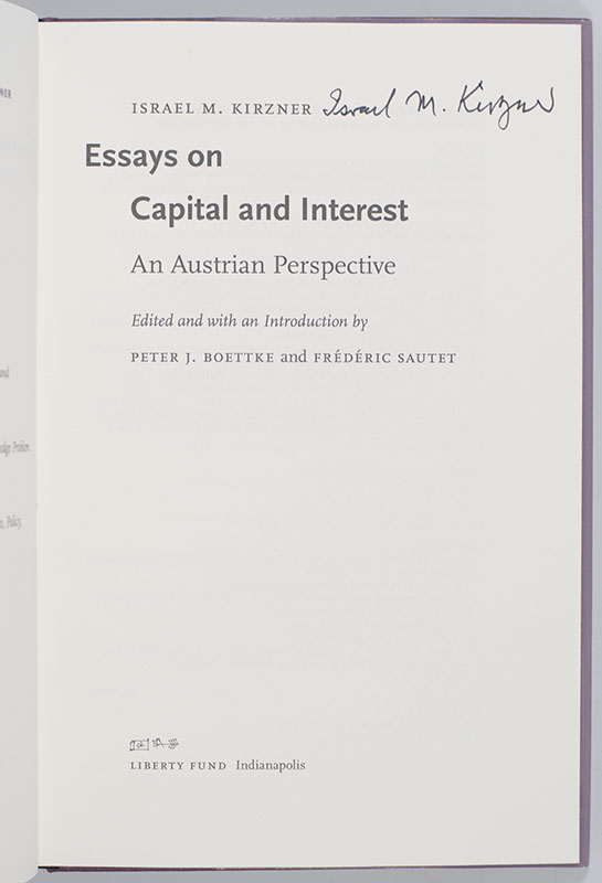 First edition of this collection of writings by Kirzner. Octavo, original cloth. Signed by Israel M. Kirzner on the title page. Fine in a fine dust jacket. Edited by Peter J. Boettke and Frederic Sautet.