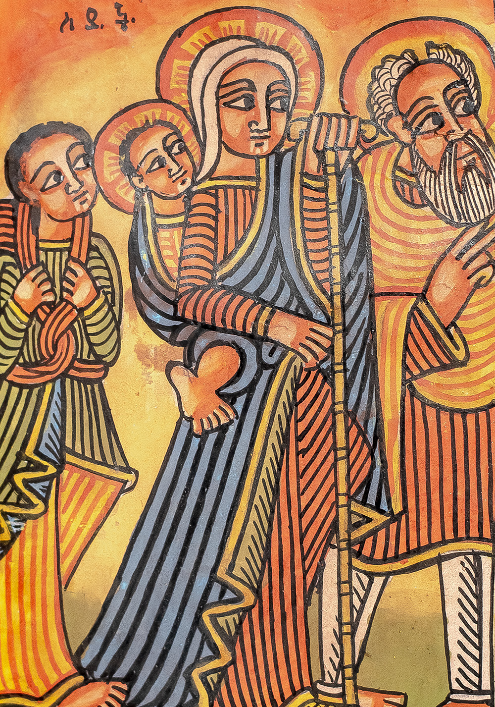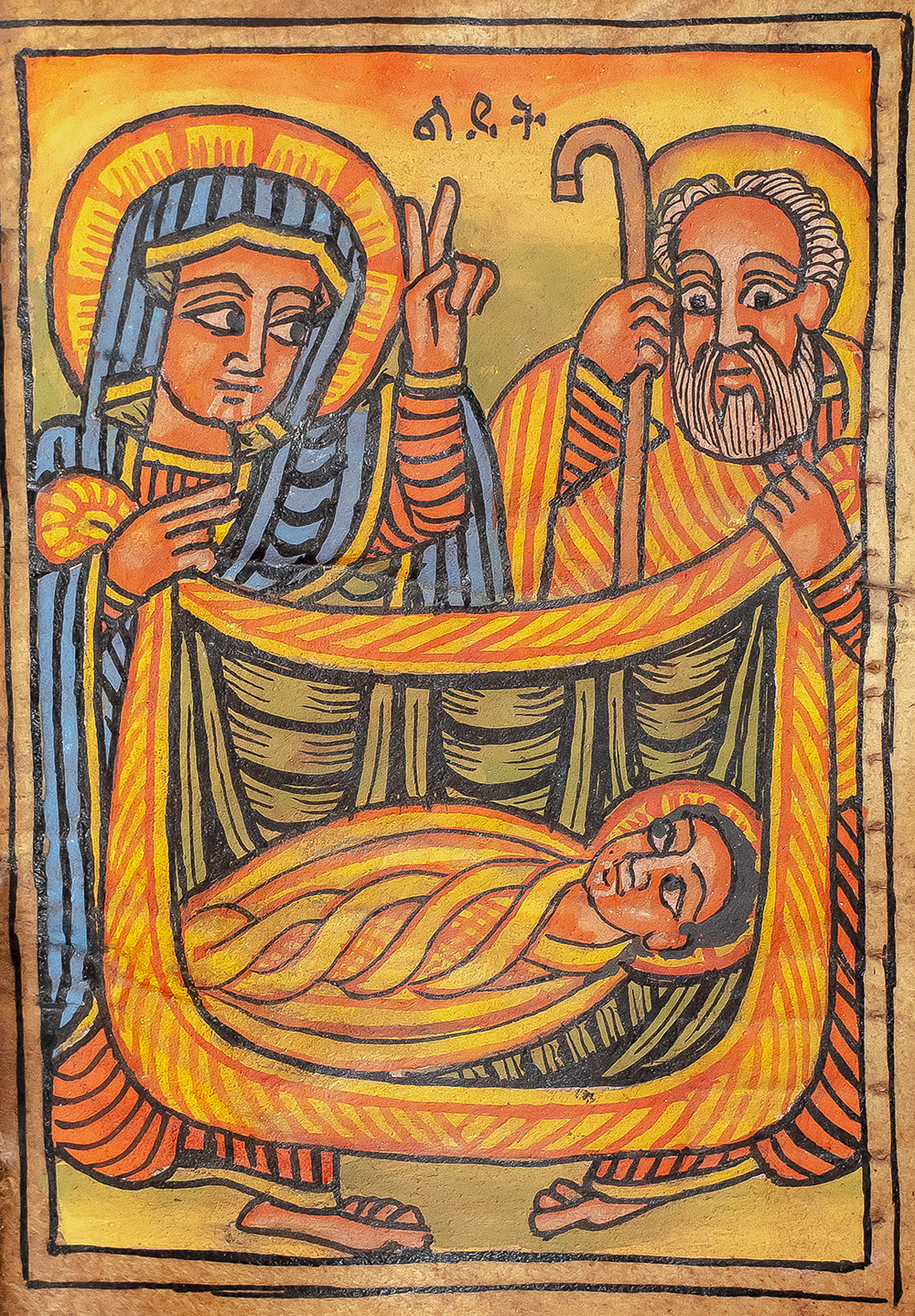 Rare illustrated Ethiopian Coptic Ge’ez Bible. Duodecimo, bound with twine between two wood blocks, parchment manuscript in black and red ink, with full-page hand-painted miniatures depicting the Transfiguration of Jesus, Saint Tekle Haymanot of Ethiopia, Saint George slaying the dragon, the Madonna and child, Jesus and Mary, the Annunciation, the Birth of Jesus, and the Journey to Bethlehem. Housed in the original leather chemise slipcase with leather carrying handle.