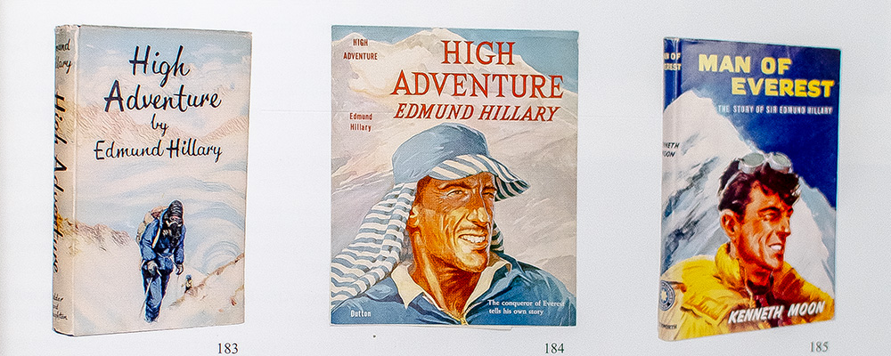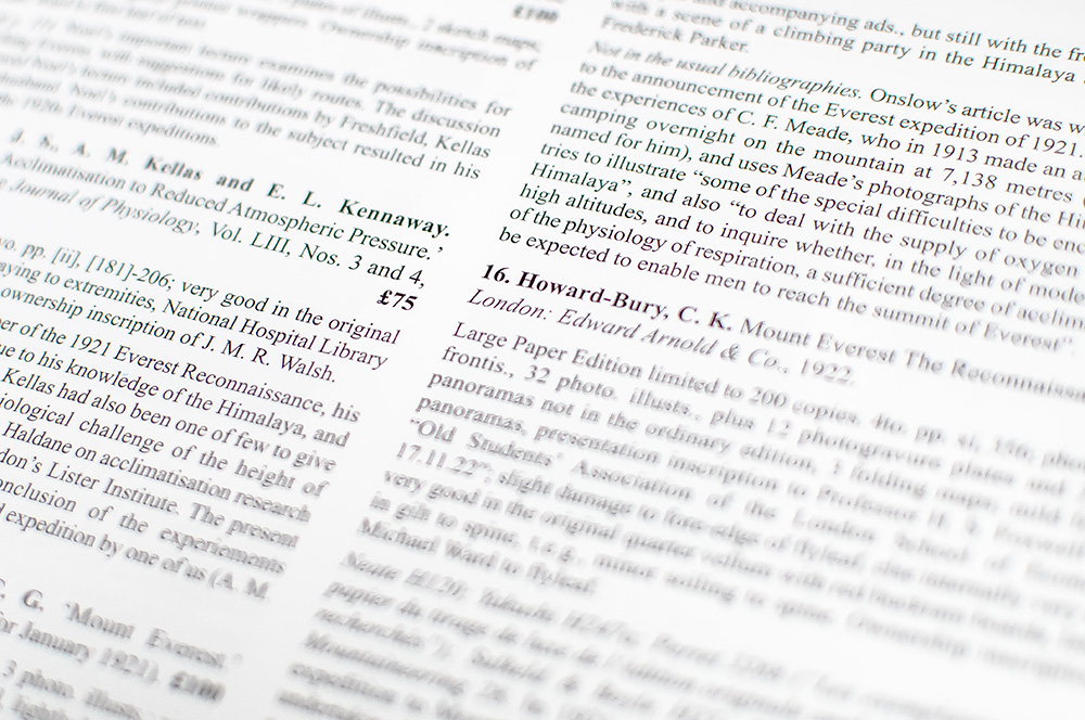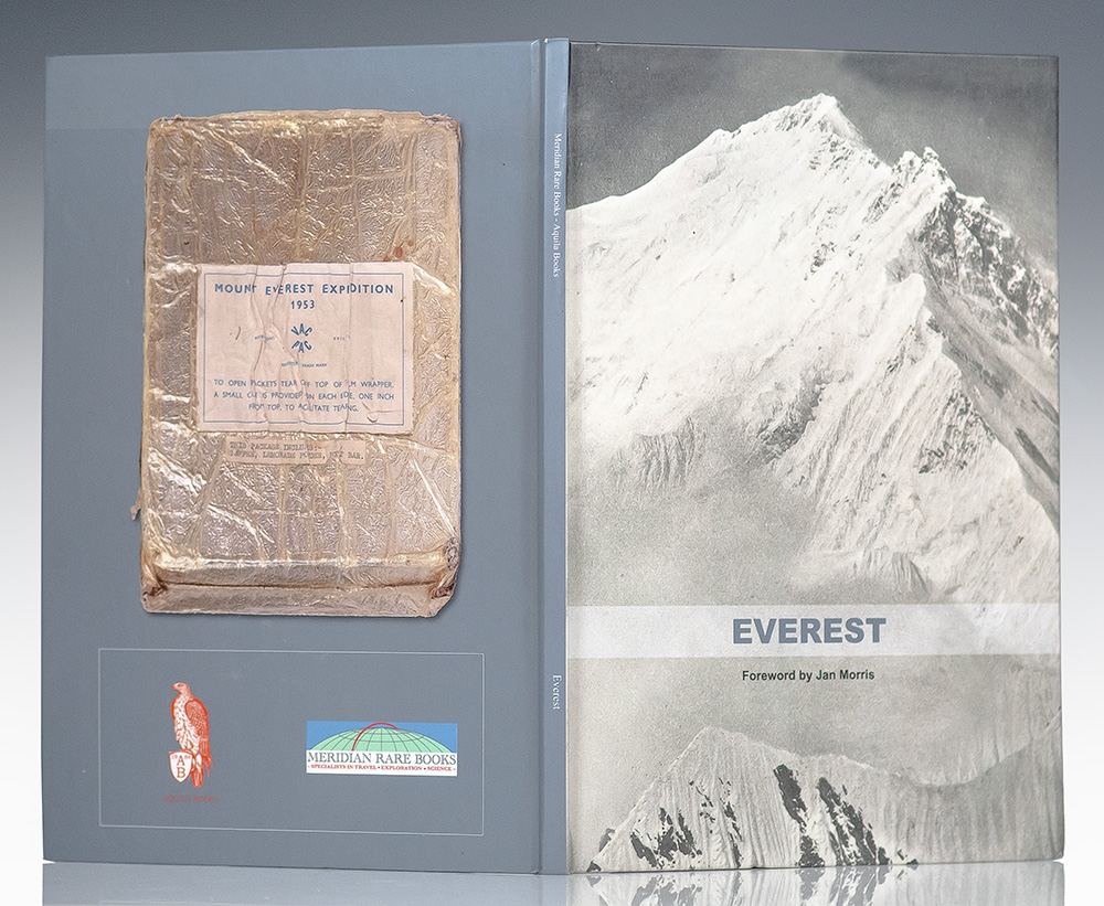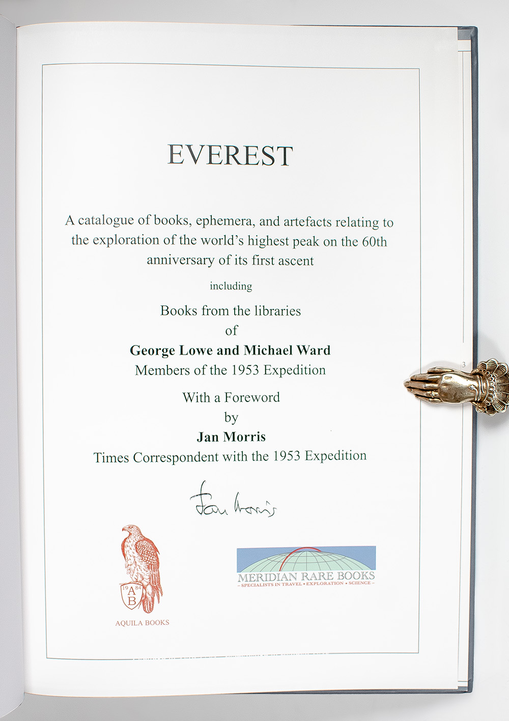 First edition catalog of books, ephemera, and artefacts relating to the exploration of the world's highest peak on the 60th anniversary of its first ascent, including books from the libraries of members of the 1953 Exploration George Lowe and Michael Ward, with a foreword by Times Correspondent to the 1953 Expedition Jan Morris. Quarto, original pictorial boards, illustrated throughout with photographs of the authors and their books. Signed on the title page by Jan Morris. In fine condition. Accompanied by a second catalogue of the same year. Quarto, original wrappers. In near fine condition.
