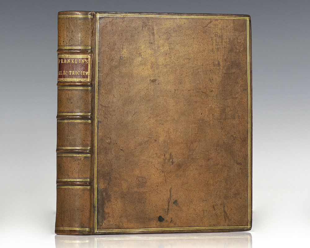 First complete edition of “the most important scientific book of 18th-century America” and “America’s first great scientific contribution” (PMM). Octavo, bound in full contemporary calf with gilt ruling to the spine in six compartments within raised bands, red morocco spine label lettered in gilt, double gilt ruling to the front and rear panels. With the rarely found half-title. Advertisement & errata leaf bound in following the preface. Illustrated with 7 copper-engraved plates, 4 of which are folding. This, the fourth, first complete, and most desirable edition of Franklin's important work contains for the first time complete notes on all of the experiments as well as correspondence between Peter Collinson, Franklin, and several other collaborators. The earlier editions, each issued in three parts as separately published pamphlets usually bound together, were carelessly published. Franklin edited this new one-volume edition himself, significantly revising the text, adding for the first time a number of his own philosophical letters and papers, introducing footnotes, correcting errors, and adding an index (Cohen, Benjamin Franklin’s Experiments). In near fine condition. Expertly rebacked. Housed in a custom full morocco clamshell box.