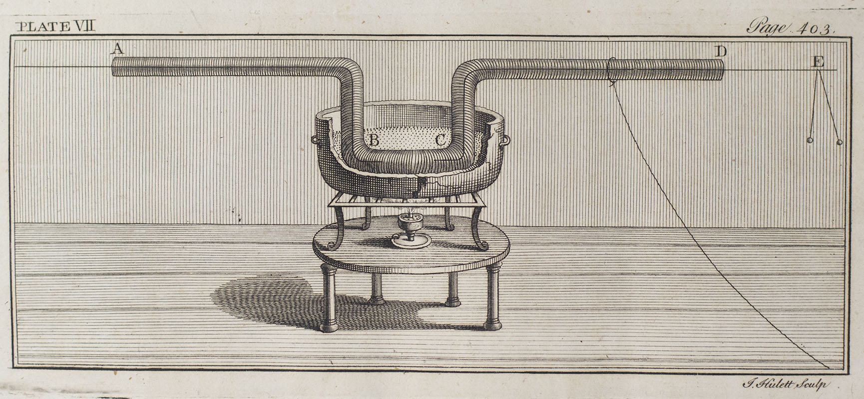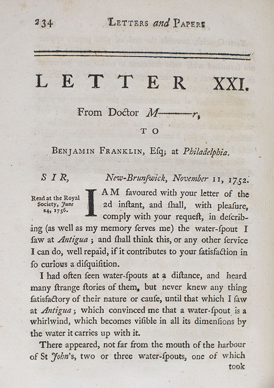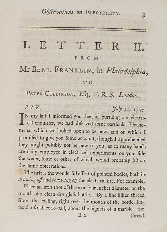 “Franklin’s most important scientific publication,” Experiments and Observations contains detailed accounts of the founding father’s crucial kite and key experiment, his work with Leiden jars, lightning rods and charged clouds (Norman 830). “The most dramatic result of Franklin’s researches was the proof that lightning is really an electrical phenomenon. Others had made such a suggestion before him— even Newton himself— but it was he who provided the experimental proof” (PMM). “The lightning experiments caused Franklin’s name to become known throughout Europe to the public at large and not merely to men of science. Joseph Priestley, in his History of Electricity, characterized the experimental discovery that the lightning discharge is an electrical phenomenon as ‘the greatest, perhaps, since the time of Isaac Newton… Franklin’s achievement… marked the coming of age of electrical science and the full acceptance of the new field of specialization” (DSB).