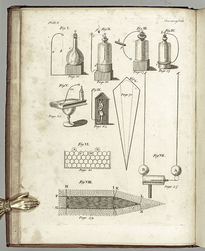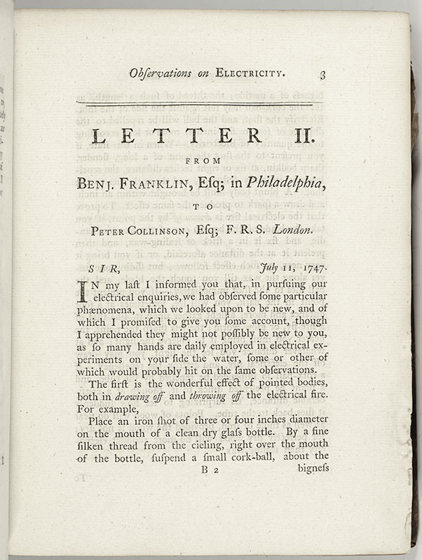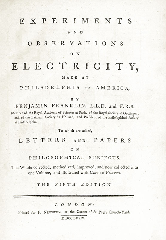 “Franklin’s most important scientific publication,” Experiments and Observations contains detailed accounts of the founding father’s crucial kite and key experiment, his work with Leiden jars, lightning rods and charged clouds (Norman 830). “The most dramatic result of Franklin’s researches was the proof that lightning is really an electrical phenomenon. Others had made such a suggestion before him— even Newton himself— but it was he who provided the experimental proof” (PMM). “The lightning experiments caused Franklin’s name to become known throughout Europe to the public at large and not merely to men of science. Joseph Priestley, in his History of Electricity, characterized the experimental discovery that the lightning discharge is an electrical phenomenon as ‘the greatest, perhaps, since the time of Isaac Newton… Franklin’s achievement… marked the coming of age of electrical science and the full acceptance of the new field of specialization” (DSB).