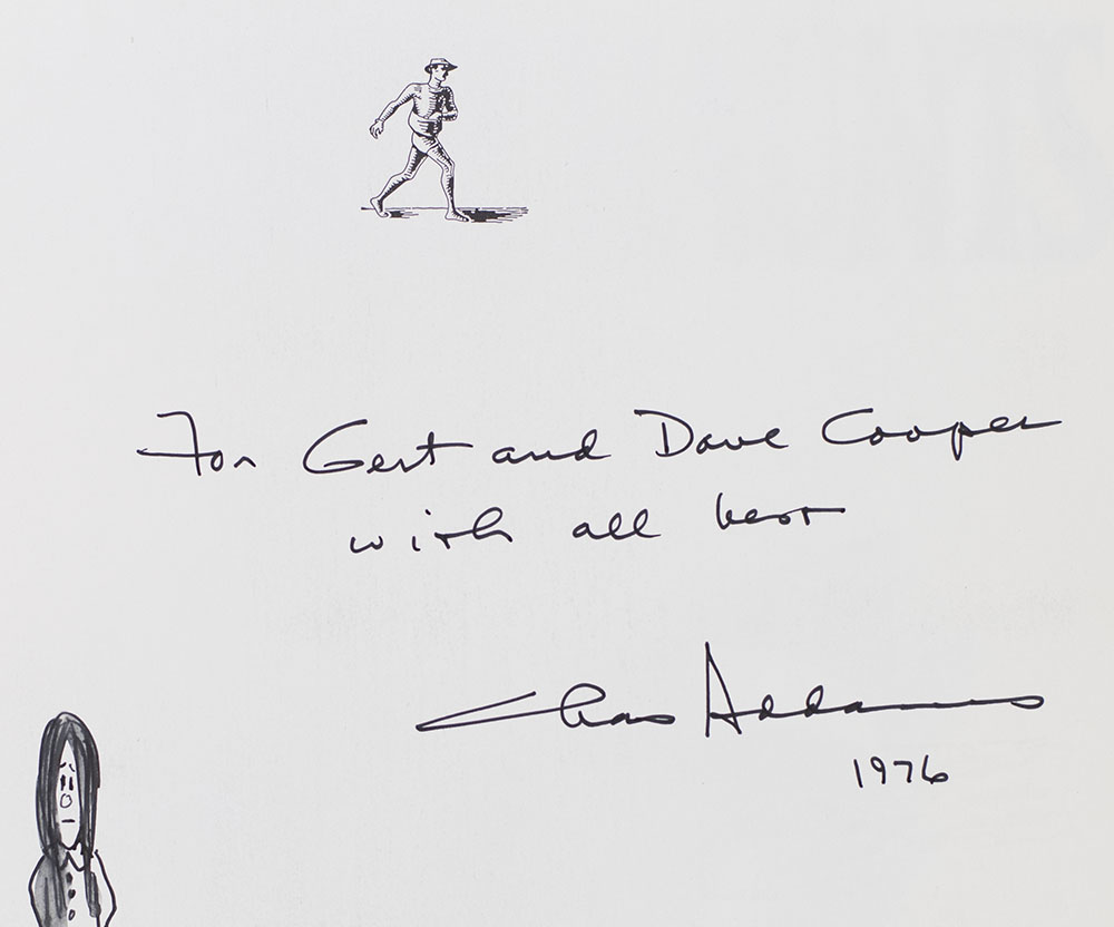 First edition of the cartoonist's second collection of Addams Family classics. Quarto, original cloth. Presentation copy, inscribed by the author in the year of publication on the flyleaf, "For Gert and Dave Copper with all best Chas Adams 1976." Addams has also added an original drawing of Wednesday Addams. Near fine in a near fine dust jacket. Jacket photograph by Michael Tighe.