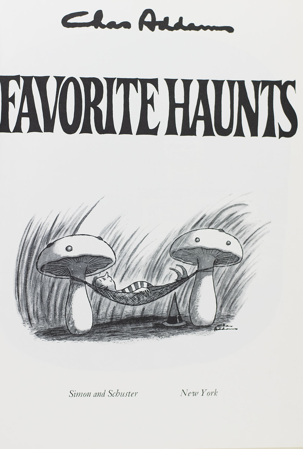 First edition of Charles Addams' Favorite Haunts; inscribed by him with an original drawing of Wednesday Addams