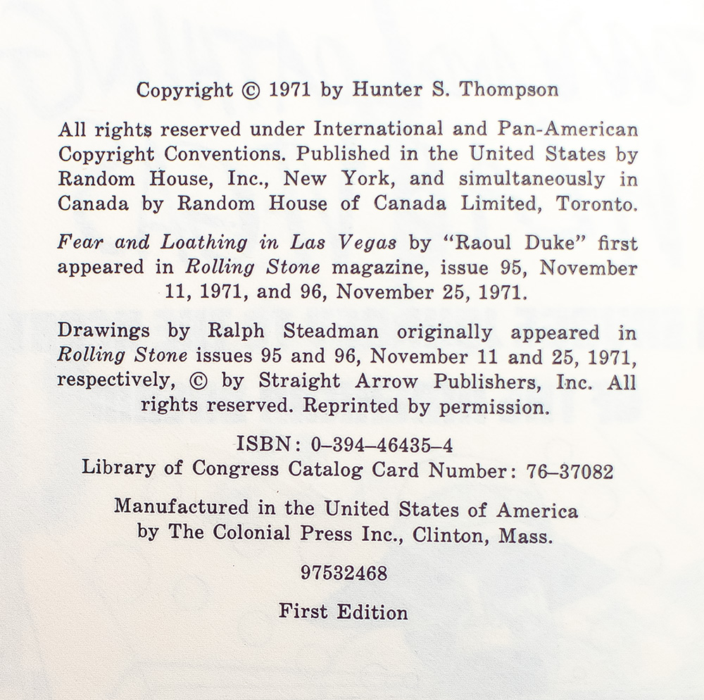 "Tune in, freak out, get beaten": First Edition of Fear and Loathing in Las Vegas; Signed by Hunter S. Thompson
