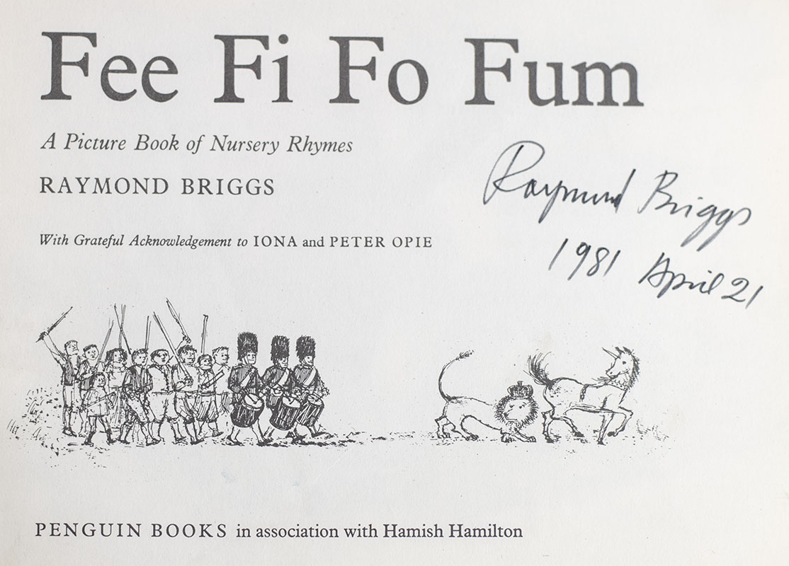 "Fee Fi Fo Fum, I smell the blood of an Englishman": Raymond Briggs' Fee Fi Fo Fum; Signed and dated by him