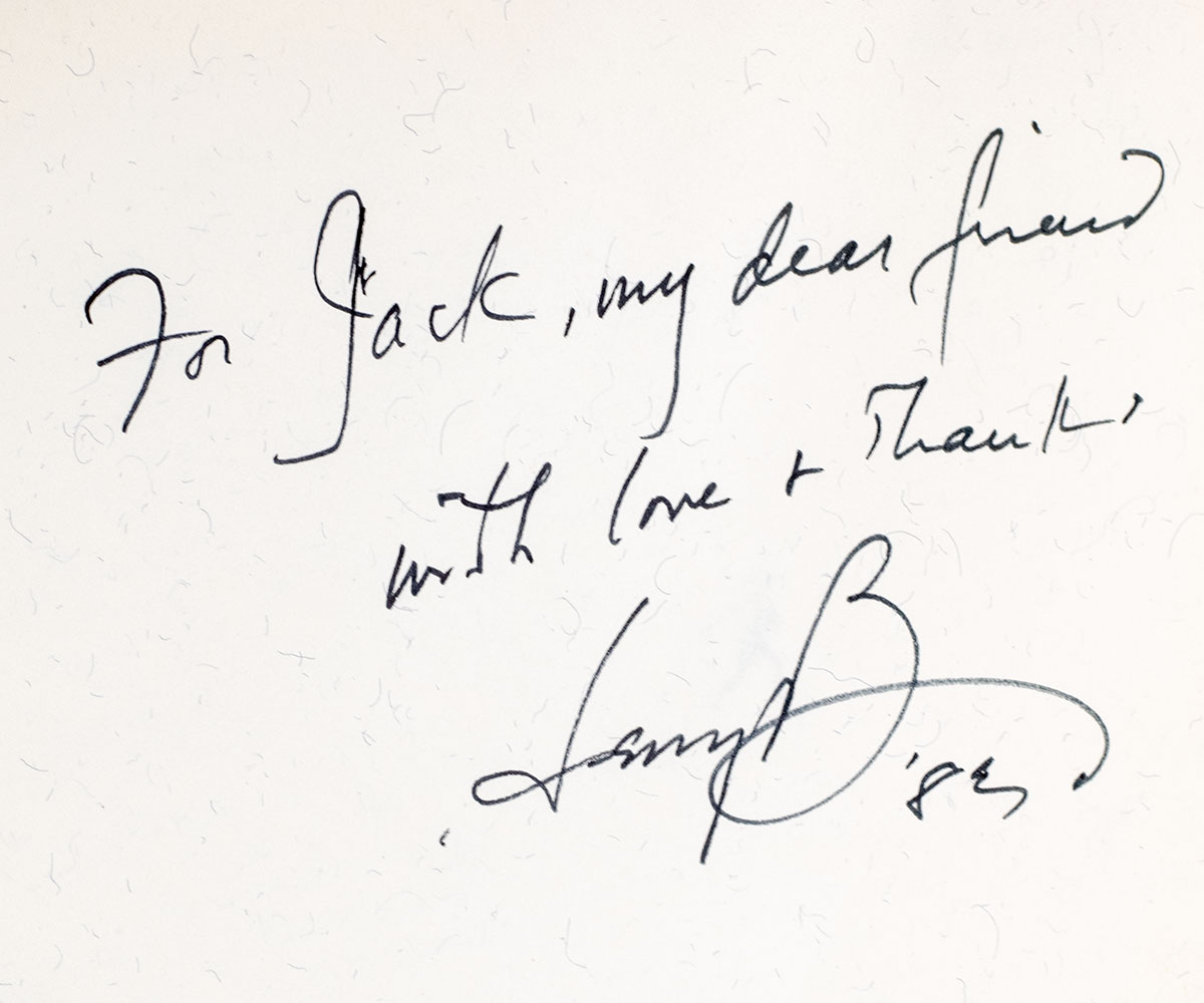 First edition of Bernstein's warm and brilliant autobiography. Octavo, original half cloth, illustrated with photographs. Association copy, inscribed by Bernstein on the front free endpaper in the year of publication, "For Jack, my dear friend with love + thanks, Lenny B '82." The recipient, Jack Gottlieb, was not only Bernstein’s personal assistant, but a trained composer and musician who played an instrumental role in the shaping and publication of Bernstein’s first three books. In his memoir “Working with Bernstein”, Gottlieb relayed, “Close to my heart were the editing jobs I did on three of Bernstein’s popular books. First was ‘The Joy of Music,’ on which I had the pleasure of working with the genial Henry Simon of Simon and Schuster. The next two books, also S&S publications, were co-edited with gentlemen who have since become distinguished men of letters: Michael Korda on ‘Young People’s Concerts for Reading and Listening’ and Robert Gottlieb (no relation) on ‘The Infinite Variety of Music’ (pp. 22-23). In addition to managing negotiations with Bernstein’s publishers, Gottlieb managed Bernstein’s over-booked professional schedule and shared the unique experience of navigating the 20th century American landscape of conducting and composition as a relative minority of Jewish faith and ancestry. Near fine in a near fine dust jacket. Jacket design by Robert Anthony, Inc. An exceptional association copy.