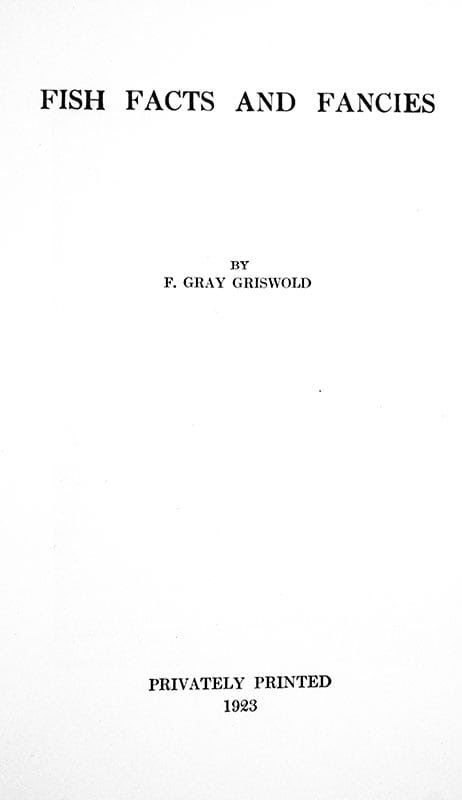 American author and sportsman Frank Gray Griswold authored dozens of books with a particular focus on salmon fishing, many printed privately and distributed among his personal friends. In Fish Facts and Fancies, Griswold covers the many aspects of both freshwater and saltwater fishing with particular attention to the life and breeding of salmon, the fighting marlin, casting lines, and fishing tackle.
