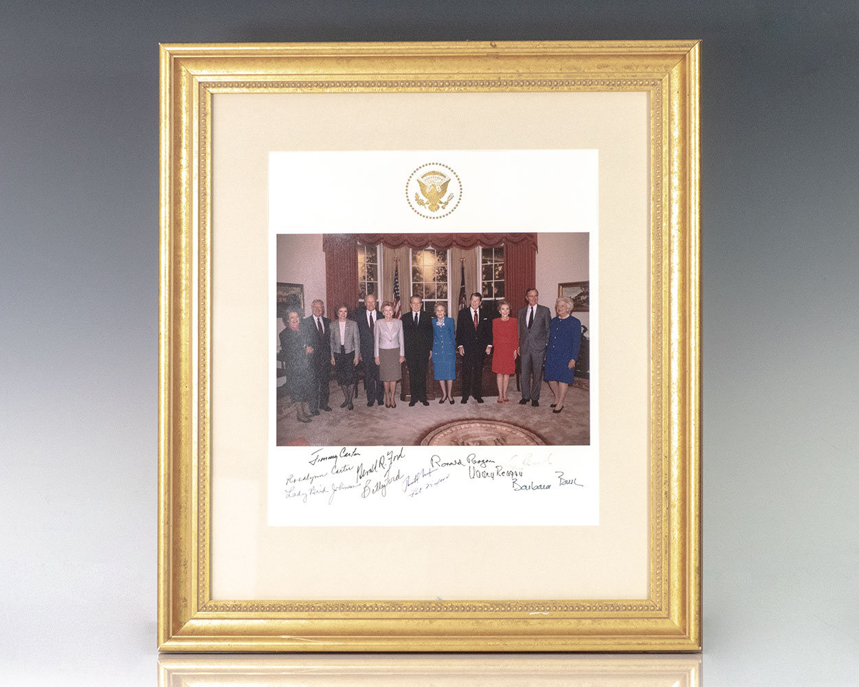 Rare color photograph taken upon the occasion of the opening of the Ronald Reagan Presidential Library on November 4, 1991. Mounted with a gilt presidential seal, the mount is signed by Lady Bird Johnson, Richard Nixon, Pat Nixon, Gerald Ford, Betty Ford, Jimmy Carter, Rosalynn Carter, Ronald Reagan, Nancy Reagan, George H.W. Bush, and Barbara Bush. Matted and framed. The entire piece measures 18.5 inches by 16.5 inches.