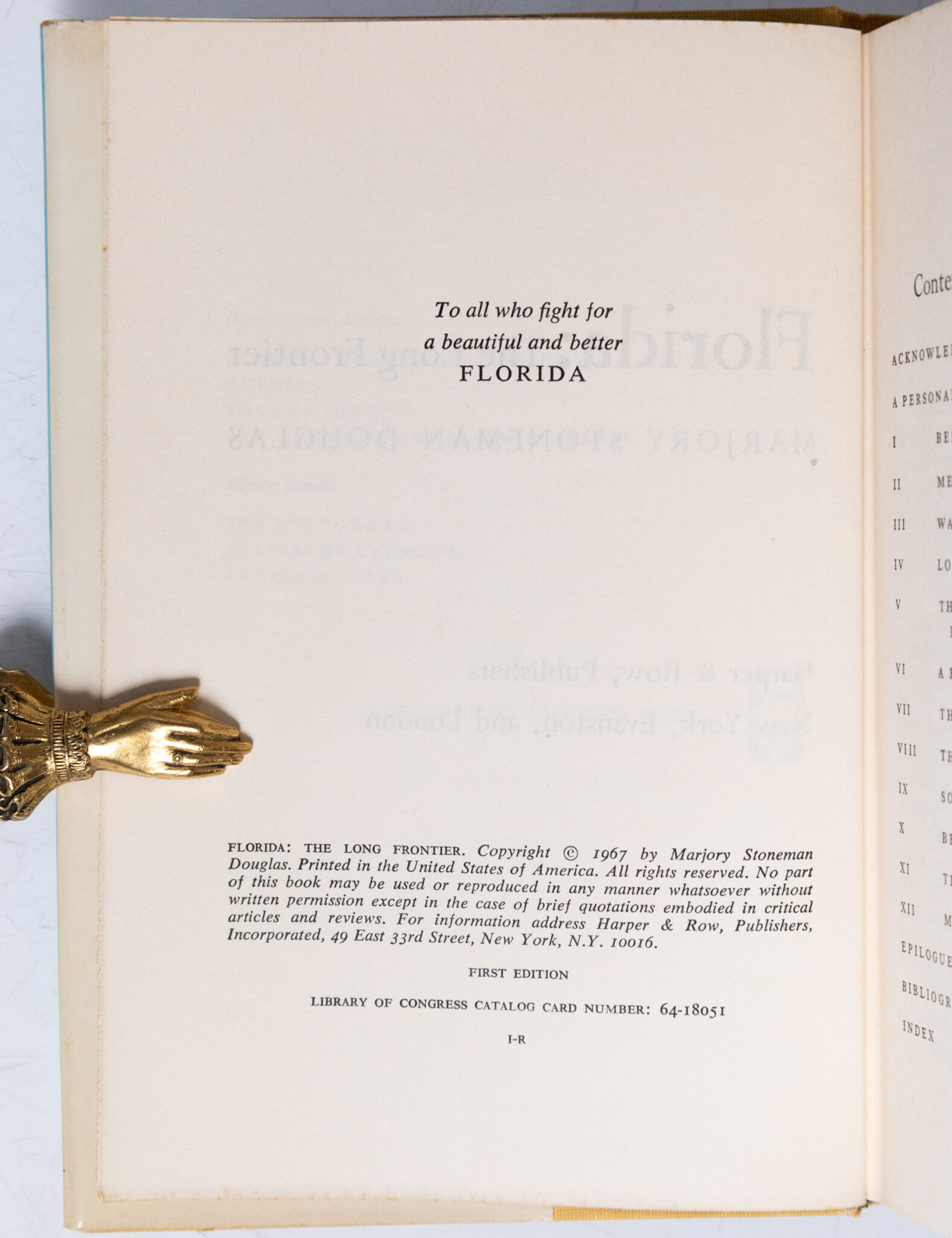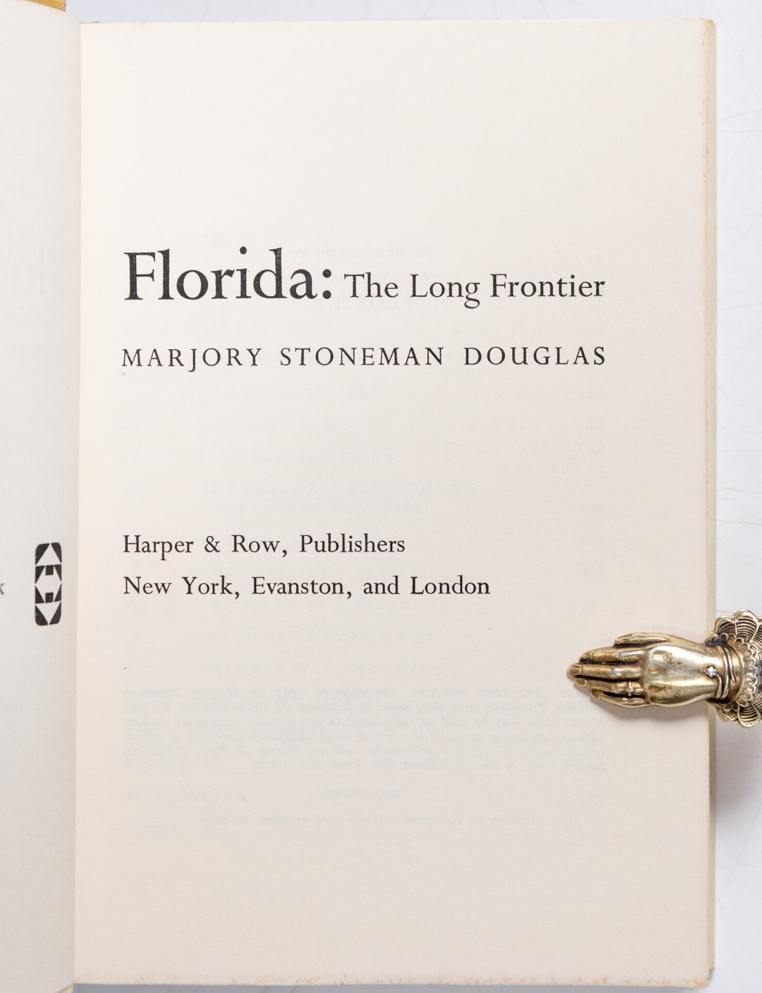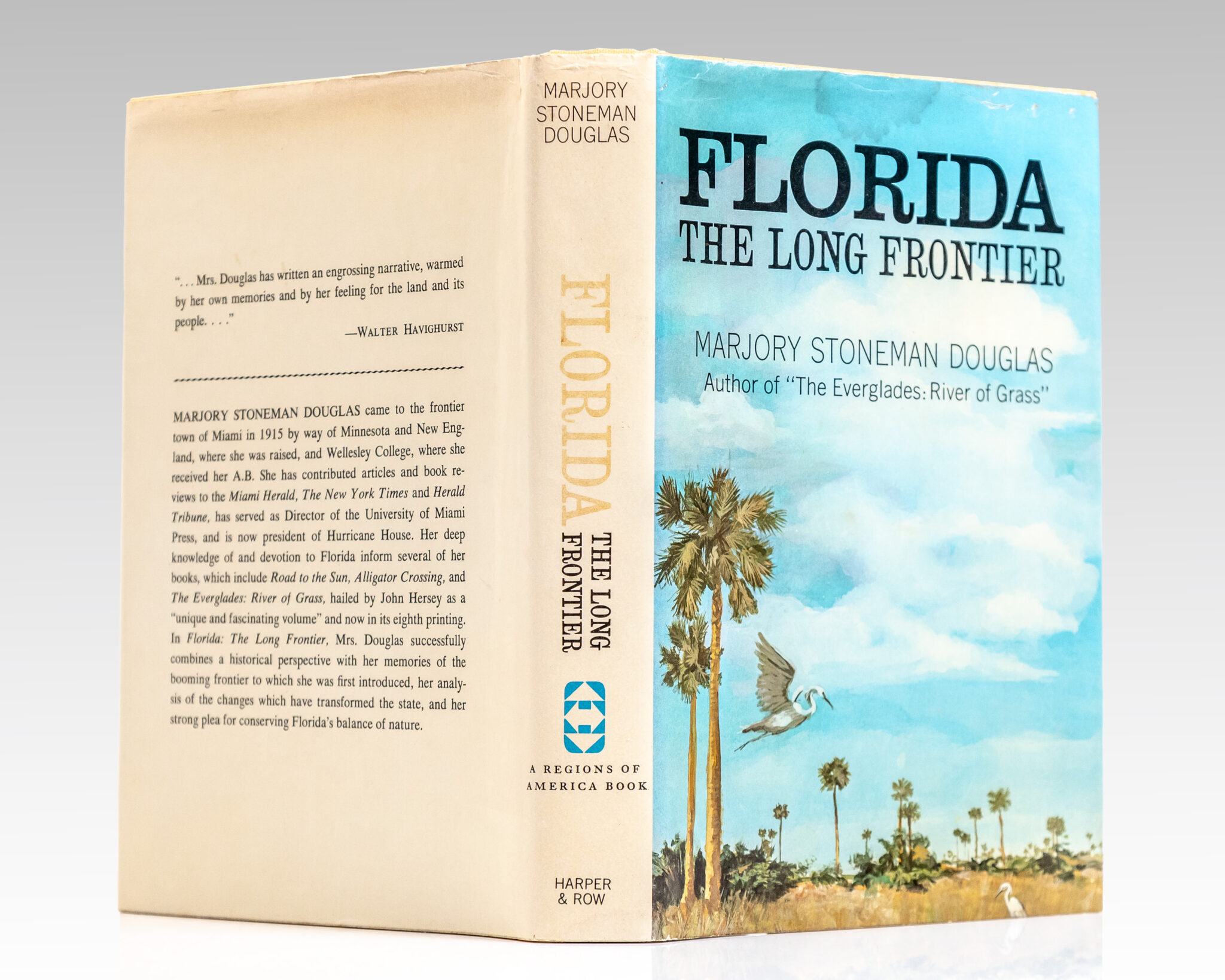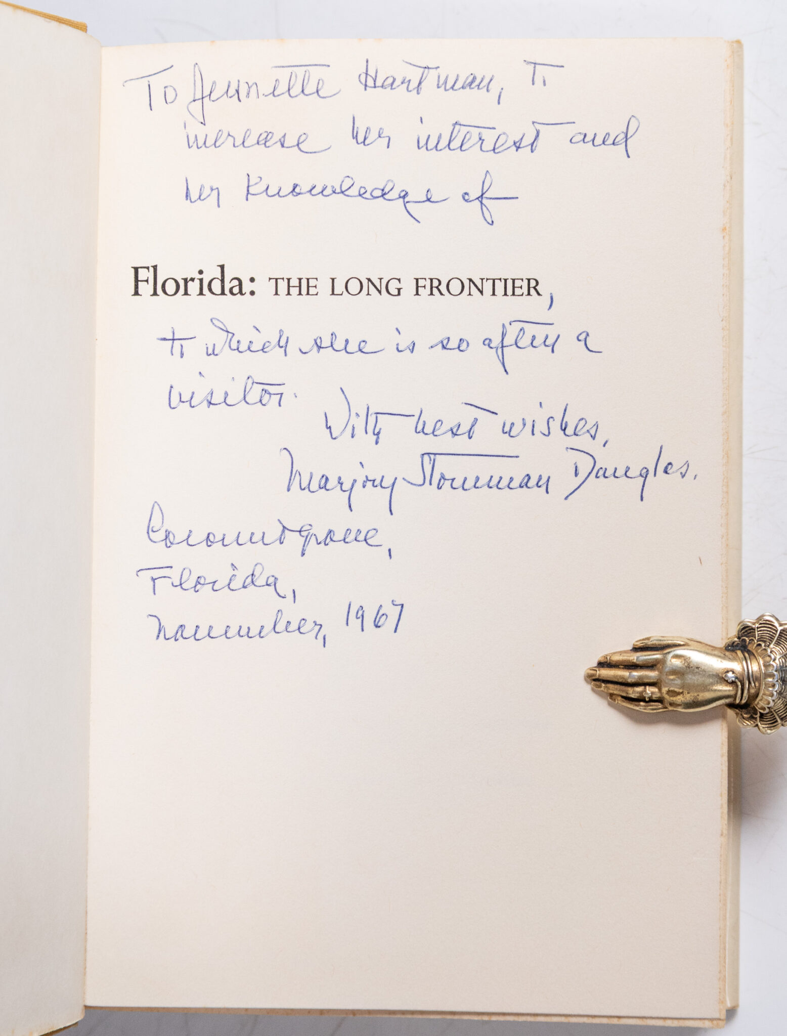 First edition of this historical and cultural study of Florida that traces the region’s development from early exploration through the modern era. Octavo, original publisher's cloth, cartographic endpapers. Presentation copy, inscribed by the author in the year of publication on the half-title page, "To Jennette Hartway, To increase her interest and her knowledge of 'Florida: The Long Frontier', to which she is so often a visitor. With best wishes, Marjory Stoneman Douglas. Coconut Grove, Florida, November, 1967." Near fine in a near fine dust jacket. A newspaper article about Douglas titled "Author Tells Of Rewarding Search" laid in. Uncommon in this condition and signed.