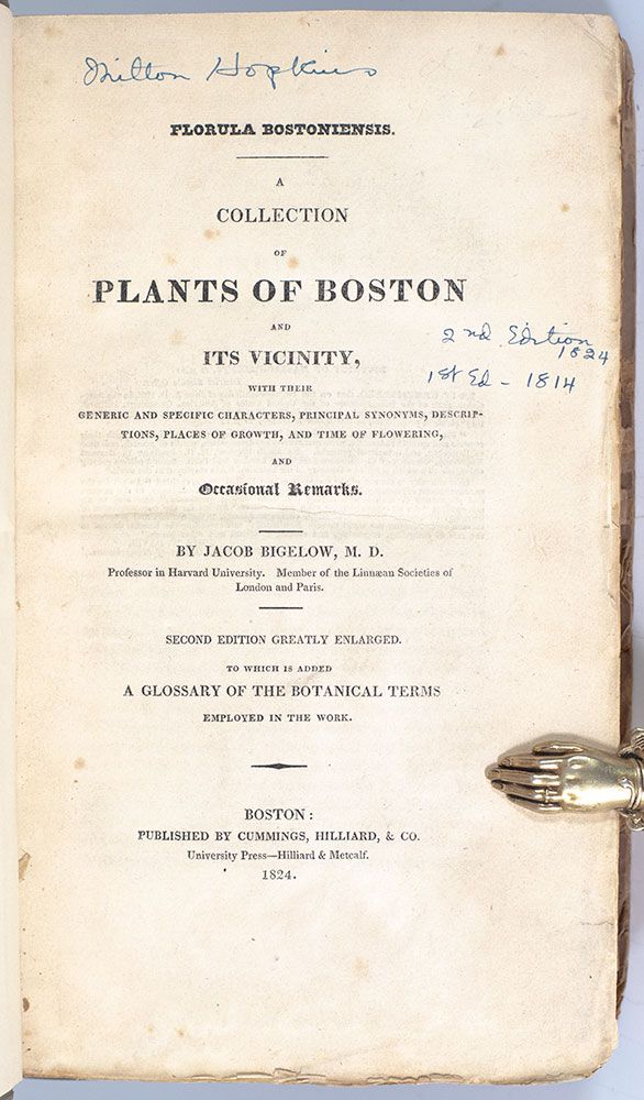Enlarged and second edition of Bigelow's authoritative work on the flora of Boston and its vicinity. Octavo, original boards, rebacked, greatly enlarged and with a significant glossary of botanical terms. In very good condition. Period ownership inscriptions and notations.