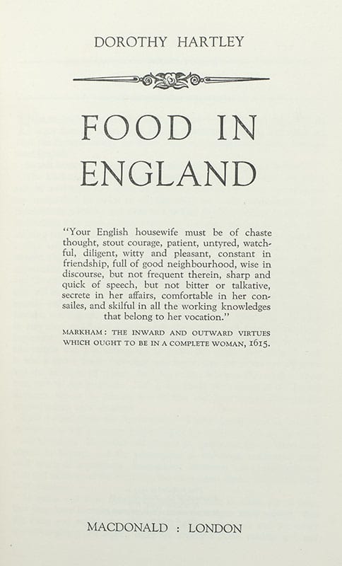 First Edition of Dorothy Hartley's Food In England; in the uncommon dust jacket