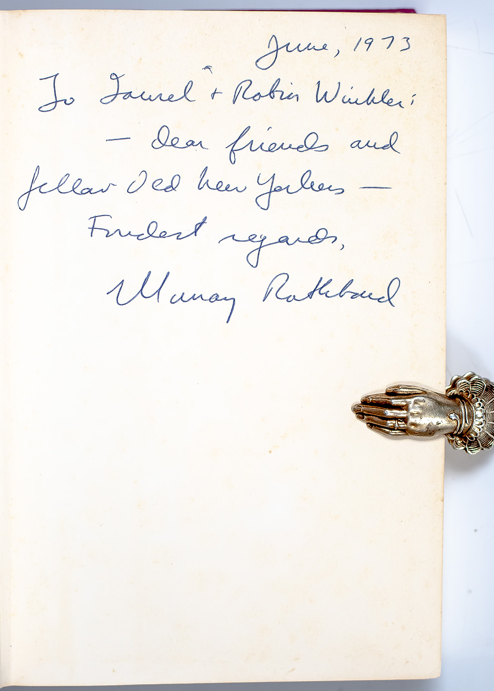 First edition of Rothbard's classic treatise on libertarianism. Octavo, original cloth. Presentation copy, inscribed by the author in the year of publication on the front free endpaper, "June, 1973 To Laurel and Robin Winkler: - dear friends and fellow old New Yorkers- Fondest regards, Murray Rothbard." Near fine in a good dust jacket. Uncommon signed.