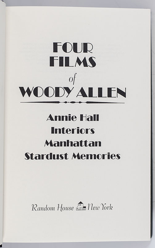 First edition of this compilation of these classic films by Woody Allen. Octavo, original half cloth. Signed by Woody Allen on the half-title page. Fine in a near fine dust jacket. Jacket design by Richard Adelson.