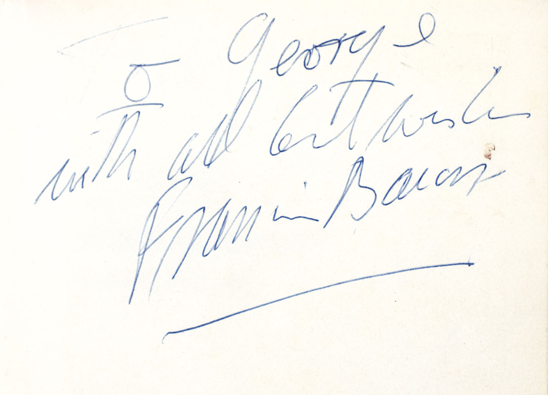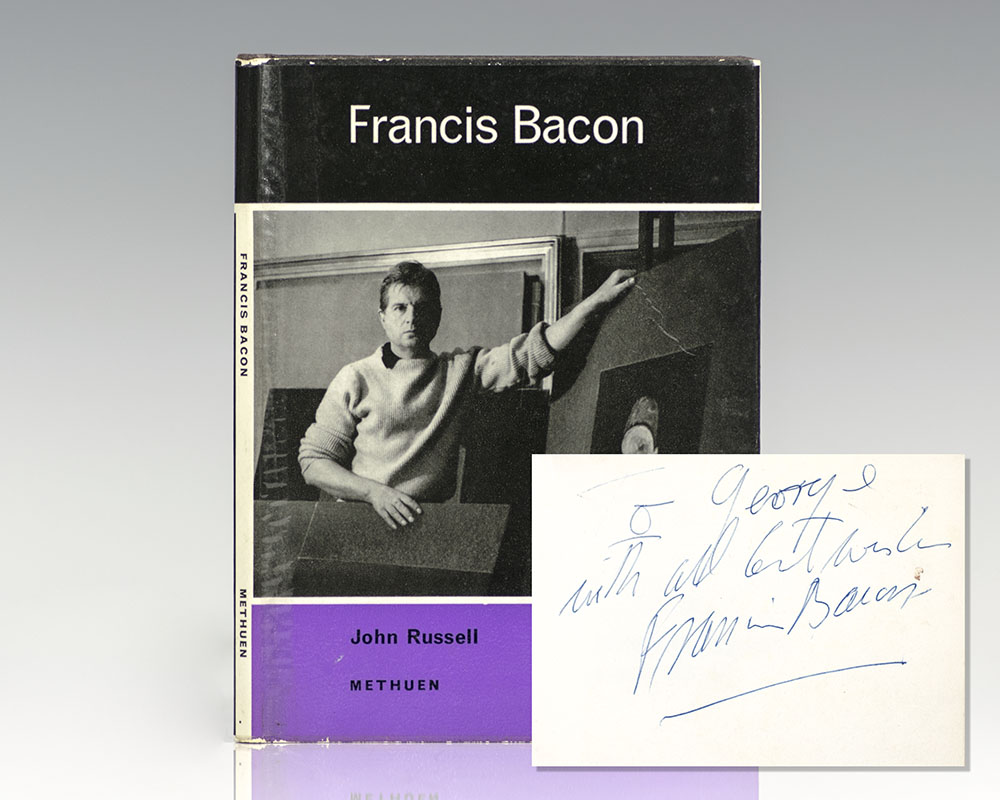 First edition of this wonderfully illustrated work on Francis Bacon. Octavo, original boards, illustrated throughout. Presentation copy, boldly inscribed on the front free endpaper, "For George with all best wishes Francis Bacon." Fine in a near fine dust jacket. Jacket photograph of Bacon on the front panel by Cecil Beaton.