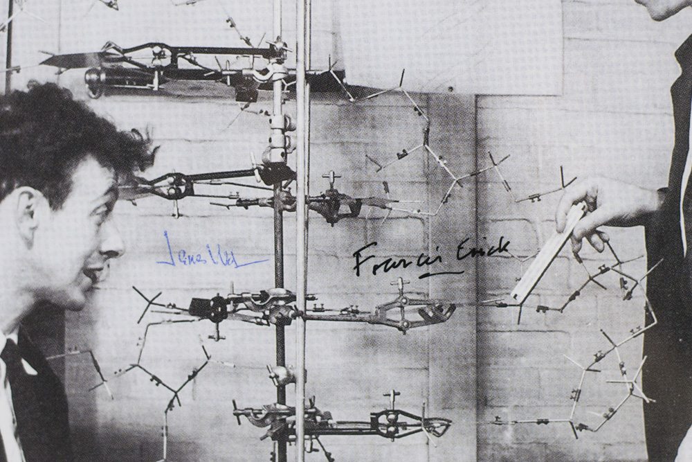 Signed black and white photograph of Francis Crick and James Watson with their DNA model at the Cavendish Laboratories in 1953. Double matted and framed, image measures 7.5 inches by 10 inches. The complete piece measures 13 inches by 15.5 inches. Signed images of Crick and Watson are rare.