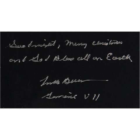 Oversized satin finish color photograph of the iconic 'Earthrise' image taken by Bill Anders during the Apollo 8 mission, signed by mission commander Frank Borman in silver felt tip, "Good night, Merry Christmas and God Bless all on Earth Frank Borman Gemini VII." In fine condition. The photograph measures 20 inches by 16 inches. A desirable image.